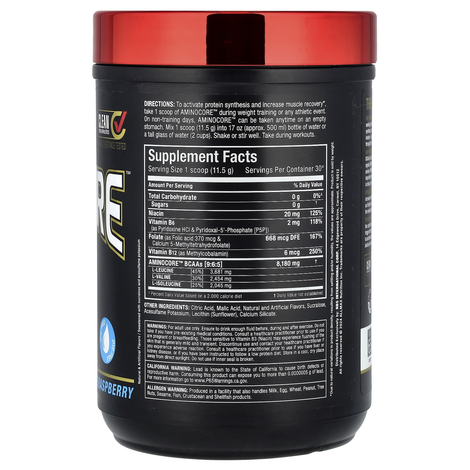 Clean For Athletes8 g BCAA0 g Sugar0 g CarbsDye FreeDietary SupplementInformed Choice – We Test You TrustRegularly Tested for Banned SubstancescGMP Registered FacilityLab Tested Every LotSoy FreeGluten Free TestedNatural & Artificial FlavorsSweetened With Sucralose and Acesulfame Potassium THE DOMINANT MUSCLE BUILDER WHY USE BRANCHED CHAIN AMINO ACIDS (BCAA)? – Supplementation is crucial for athletes seeking to build muscle. BCAA are the primary building blocks for muscle growth, muscle protein synthesis, and lean muscle tissue and/or mass. Unlike other non-essential amino acids, BCAA Aminos – Leucine, Valine and Isoleucine – cannot be produced by the body, so must be provided through diet or supplementation.WHY USE ALLMAX AMINOCORE? – Not all BCAA are created equal. AMINOCORE delivers 8.18 g of BCAA in a 9:6:5 clinically proven ratio to provide a 350% increase in the activation of muscle growth signals. With the use of pure, free form source of BCAA, AMINOCORE has no added fillers or non-BCAA aminos. AMINOCORE’s 9:6:5 BCAAs are purified and tested prior to flavoring so they do not contain impurities resulting in cloudiness, oil foam, sediment, and the worst – a hard bitter taste! Aminocore is clean, pure, and the best-tasting BCAA supplement money can buy!INTELLIGENT DIET SUPPORT – AMINOCORE feeds your muscles during diet and exercise to increase muscle protein synthesis, whether you want to build more muscles or simply maintain it, as it helps to alleviate the effects of muscle loss. Additional B-Vitamins further assist in maintaining the metabolic power. THE SCIENCE OF MUSCLE GROWTH – AMINOCORE 9:6:5 BCAA ratio is clinically proven to increase the activation of muscle growth signals. Scientific studies have identified mTor-p70S6K as the trigger directly responsible for extreme muscle growth. Supplementing with BCAA has been shown to activate increased mTor-p70S6K cellular signaling responsible for muscle growth. The result: you build and retain more hard earned lean muscle and maintain a higher metabolism.‡CLEAN FOR ATHLETES. BANNED SUBSTANCE TESTED. This product has been skip-lot tested for banned substances for the assurance of athletes and supplement users under the Informed Choice program. ‡Combined with intense resistance training, research has shown that 8,180 mg of BCAA in a 9:6:5 ratio increase signaling within muscle cells to upregulate protein synthesis (growth) by 350%. Research conducted at the Nobel Prize winning Karolinska Institute in Stockholm, Sweden. Journal reference: Karlsson et. al. Am J Physiol Endocrinol Metab 287: E1-E7, 2004.