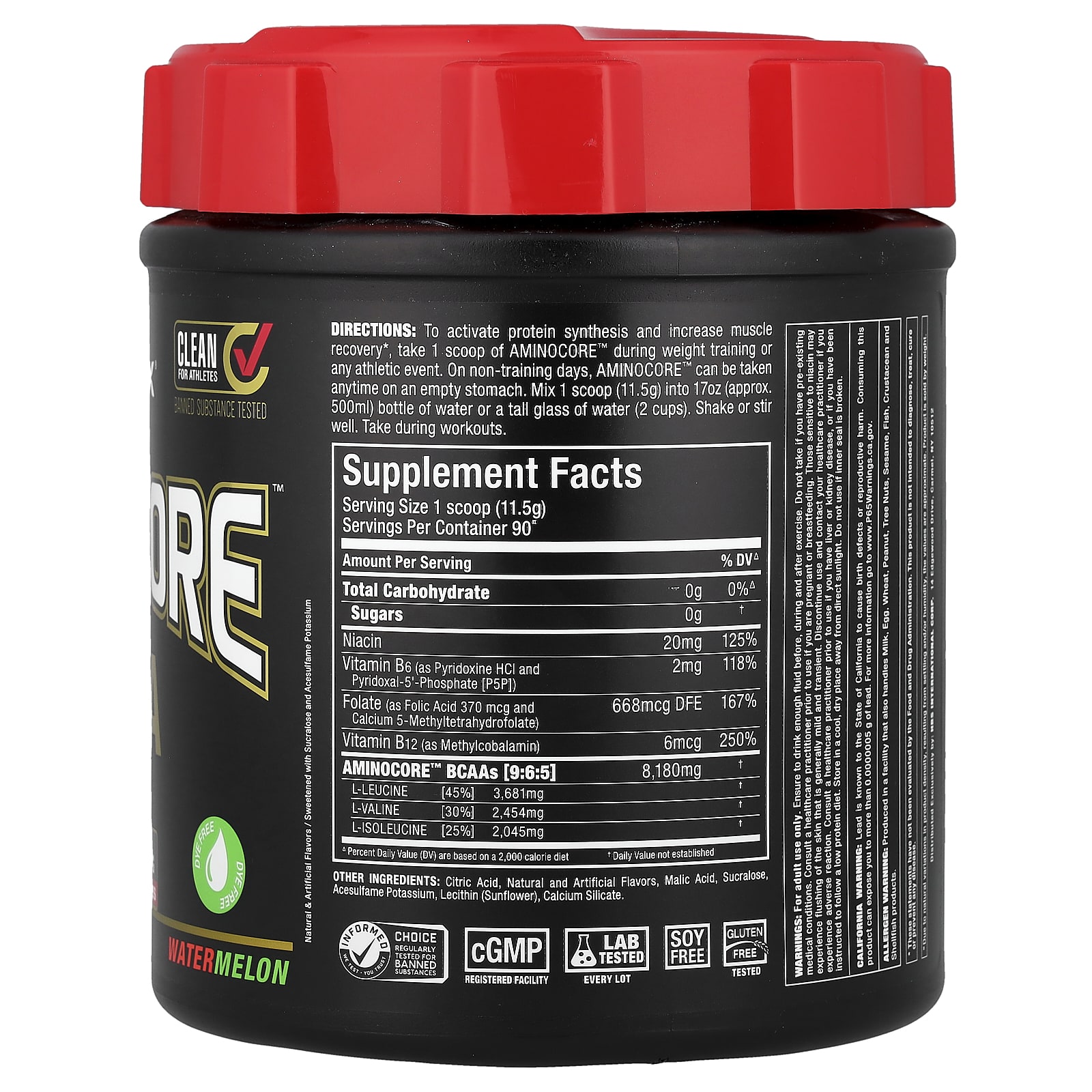 90 ServingsClean For AthletesBanned Substance Tested8 g BCAA0 g Sugar0 g CarbsDietary Supplement Dye FreeNatural & Artificial FlavorsSweetened With Sucralose and Acesulfame PotassiumInformed – We Test – You Trust cGMP Registered FacilityLab Tested Every LotSoy FreeGluten Free TestedThe Dominant Muscle Builder Why use branched chain amino acids (BCAA)? Supplementation is crucial for athletes seeking to build muscle. BCAA are the primary building blocks for muscle growth, reduced muscle breakdown and facilitation of fat loss. Unlike other amino acids, BCAA aminos – leucine, valine and isoleucine – cannot be produced by the body, so must be provided through diet or supplementation. Why use ALLMAX AMINOCORE? Not all BCAA are created equal. AMINOCORE delivers 8.18 g of BCAA in a 9:6:5 ratio clinically proven to provide a 350% increase in activation of muscle growth signals! The purest, free-form source of BCAA, AMINOCORE has no added fillers or non-BCAA aminos. AMINOCORE’S 9:6:5 BCAAs are 100% pure prior to flavoring. Typical 2:1:1 sources contain impurities resulting in cloudiness, oily foam, sediment, and the worst – a harsh bitter taste! AMINOCORE is the cleanest, purest, best-tasting BCAA supplement money can buy!Intelligent Diet Support. AMINOCORE feeds your muscles during diet and exercise to dramatically decrease muscle loss. Additional B-Vitamins further assists in enhancing metabolic power and improving energy levels.The Science of Muscle Growth. AMINOCORE 9:6:5 BCAA ratio is clinically proven to increase the activation of muscle growth signals. Scientific studies have identified mTor-p70S6K as the trigger directly responsible for extreme muscle growth. Supplementing with BCAA has been shown to activate increased mTor-p70S6K cellular signaling responsible for muscle growth. The result: you build and retain more hard earned lean muscle and maintain a higher metabolism.‡This product has been skip-lot tested for banned substances for the assurance of athletes and supplement users under the Informed Choice program.‡Combined with intense resistance training, research has shown that 8,180 mg of BCAA in a 9:6:5 ratio increase signaling within muscle cells to upregulate protein synthesis (growth) by 350%. Research conducted at the Nobel Prize winning Karolinska Institute in Stockholm, Sweden. Journal reference: Karlsson et. al. Am J Physiol Endocrinol Metab 287: E1-E7, 2004.