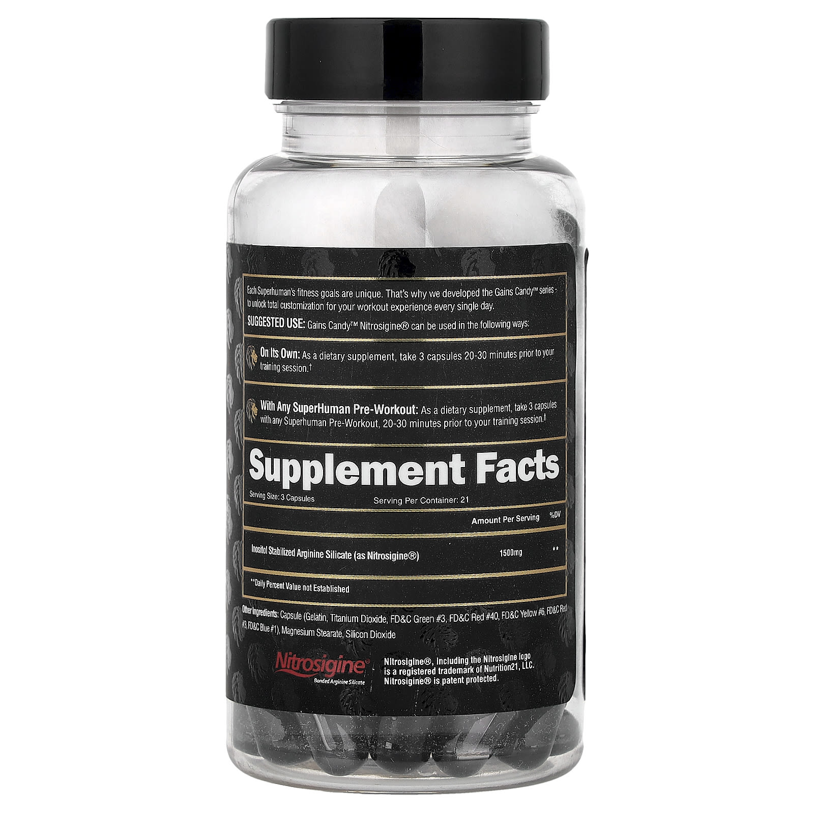 Gains Candy™ Nitrosigine® can be used in the following ways:On Its Own: As a dietary supplement, take 3 capsules 20-30 minutes prior to your training session.With Any SuperHuman Pre-Workout: As a dietary supplement, take 3 capsules with any Superhuman Pre-Workout, 20-30 minutes prior to your training session.