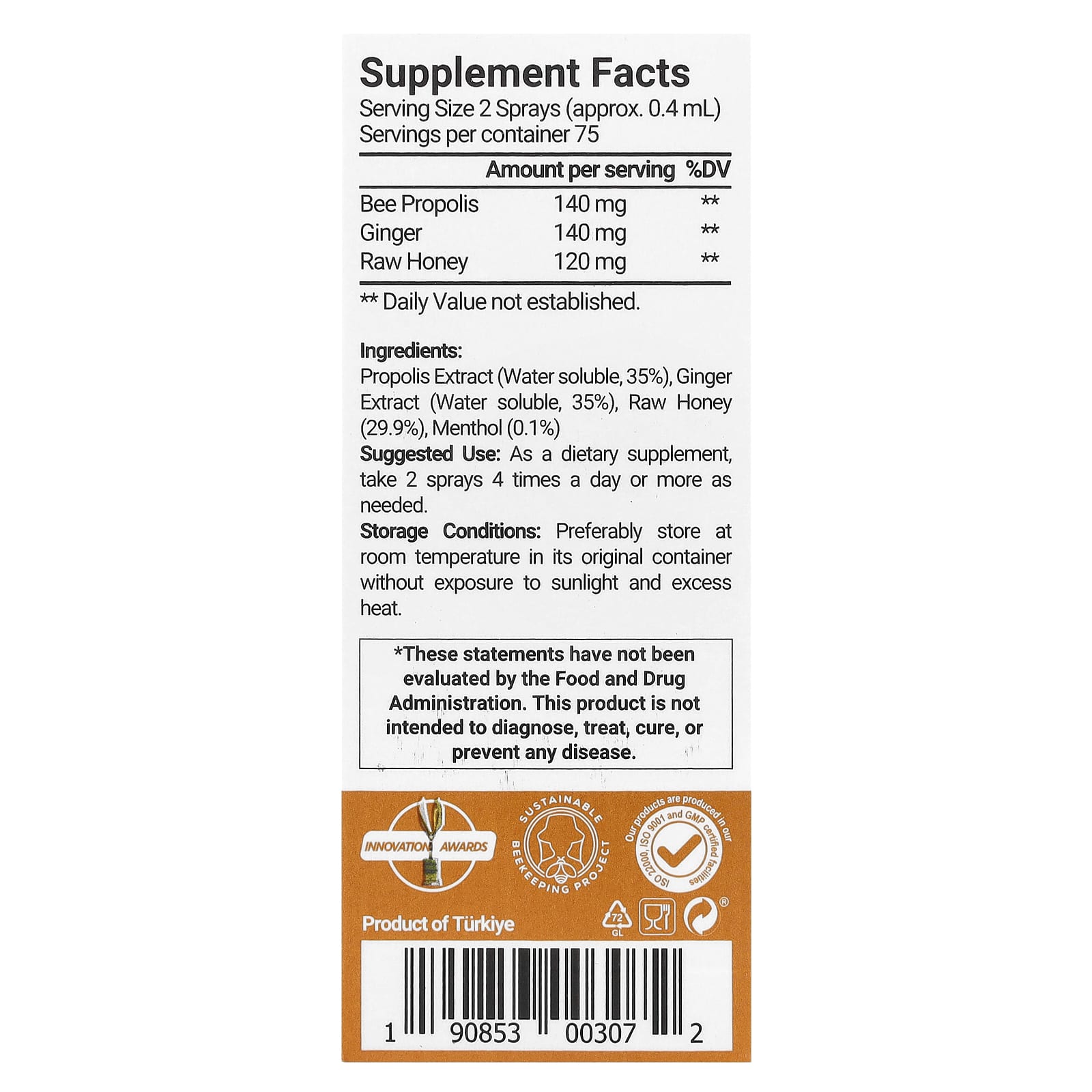 Propolis extract (water soluble, 35%), ginger extract (water soluble, 35%), raw honey (29.9%), menthol (0.1%). Our products are produced in our ISO 22000, ISO 9001 and GMP certified facilities.