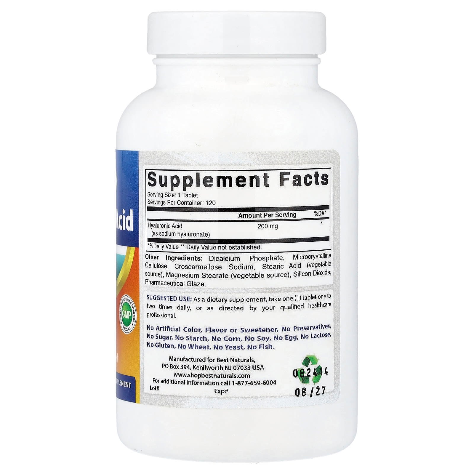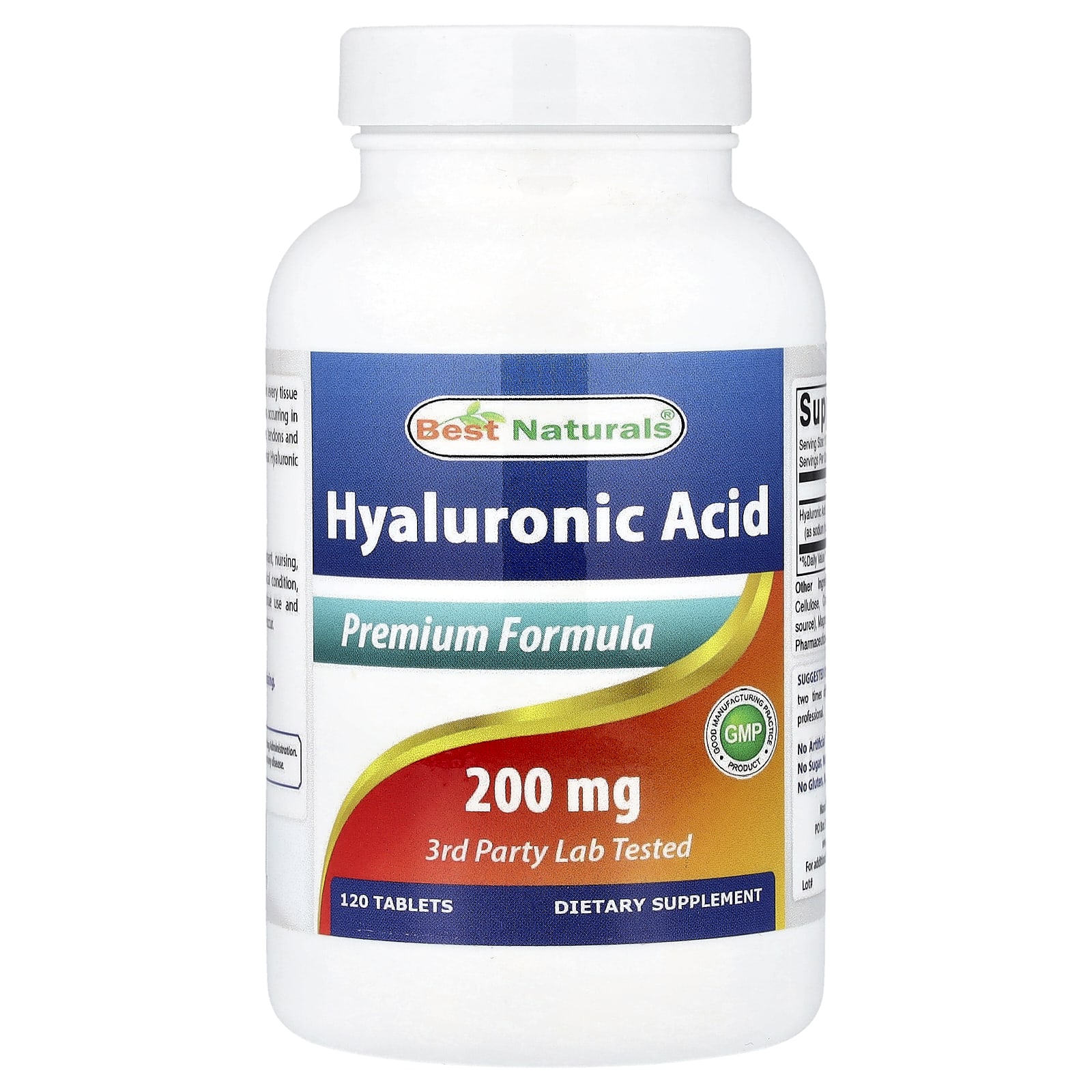 Premium FormulaGMP- Good Manufacturing Practice Product3rd Party Lab TestedDietary SupplementHyaluronic Acid is a polysaccharide present in every tissue of the body, with the highest concentrations occurring in connective tissue, including joints, ligaments, tendons and skin. Certain research publications indicate that Hyaluronic Acid may help support the following:Supports healthy joints.Supports youthful skin.