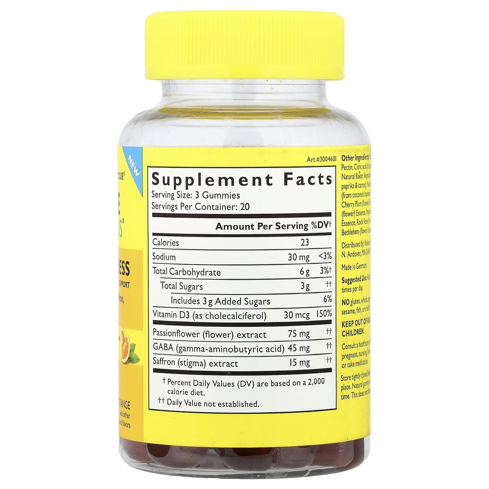 From the Makers of Bach® Rescue®Passionflower, GABA, Saffron, Vitamin DSupports the Body’s Stress Response & Promotes a Sense of CalmDietary SupplementWith Other Natural Flavors5 Flower EssencesVeganNon-Habit FormingSaffron helps with stress management in daily life & promotes a feeling of calm & serenity.GABA & traditional passionflower to help support relaxation.Vitamin D, the sunshine vitamin.No gelatin, artificial flavors or sweeteners, synthetic dyes.