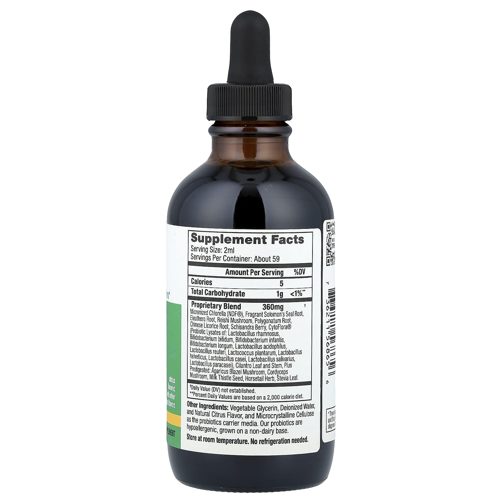 Vegetable glycerin, deionized water, and natural citrus flavors, and microcrystalline cellulose as the probiotics carrier media.Our probiotics are hypoallergenic, grown on a non-dairy base.
