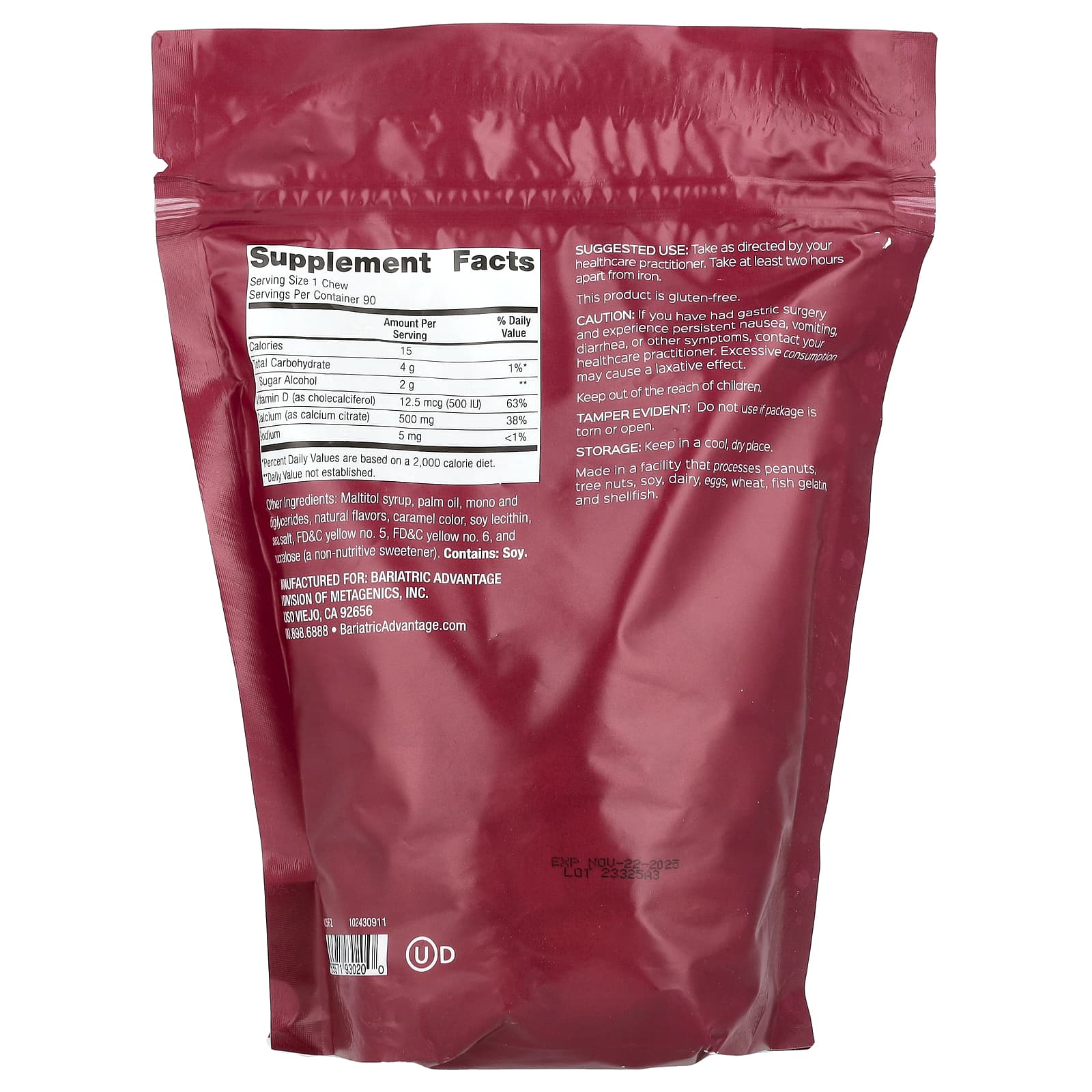 500 mg Calcium500 IU Vitamin D3Flavored with Other Natural FlavorsDietary SupplementIndividually WrappedThis Product is Gluten FreeKosher DairyBariatric Advantage Calcium Citrate Chewy Bite 500 mg is specially formulated for bariatric patients, utilizing 500 mg calcium from only calcium citrate and delivering 500 IU of vitamin D3 to support calcium absorption.