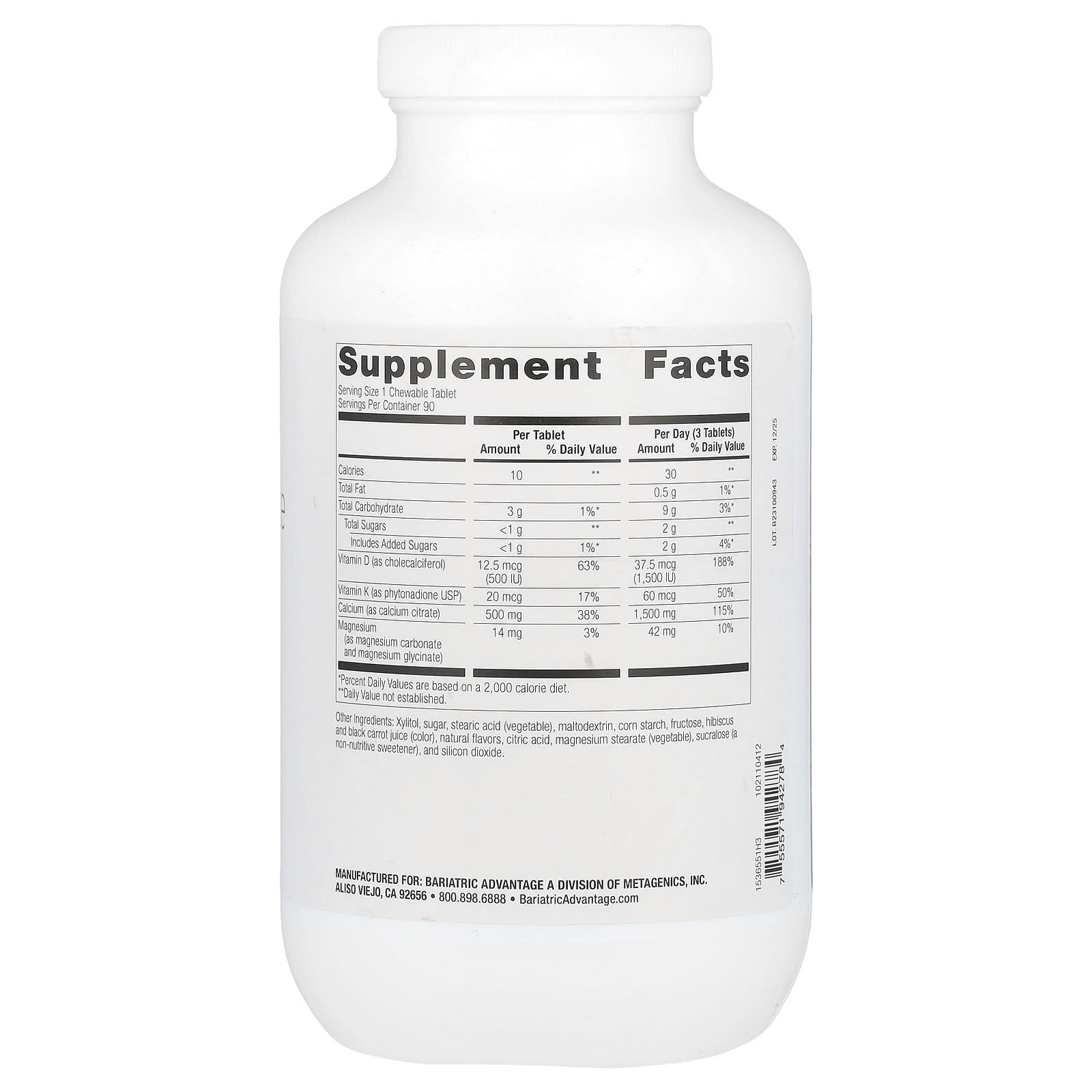 500 mg Calcium500 IU Vitamin D3Flavored With Other Natural FlavorsDietary SupplementThis Product is Gluten-FreeBariatric Advantage Chewable Calcium Citrate tablets are specially formulated for bariatric patients, utilizing 500 mg calcium from only calcium citrate and delivering 500 IU of vitamin D3 to support calcium absorption.