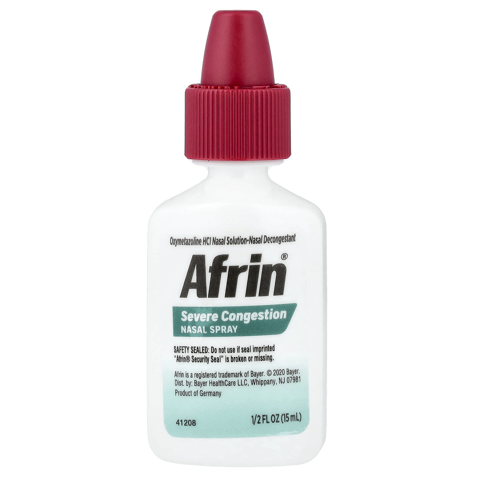 Oxymetazoline HCl Nasal Solution-Nasal DecongestantRelieves Nasal Congestion & Sinus Congestion/PressurePlus MentholUnblocks in Seconds*Lasts 12 HRSNo1 Recommended Doctor and Pharmacist† Recommended Nasal Spray BrandAfrin® Severe Congestion is a maximum strength formula with cooling menthol.Uses:Temporarily relieves nasal congestion due to:Common coldHay feverUpper respiratory allergiesTemporarily relieves sinus congestion and pressureShrinks swollen nasal membranes so you can breathe more freely†Pharmacy Times survey*It unblocks your nose in seconds, providing 12 hours of nasal congestion relief without drowsiness, so you can breathe more freely all day or all night.
