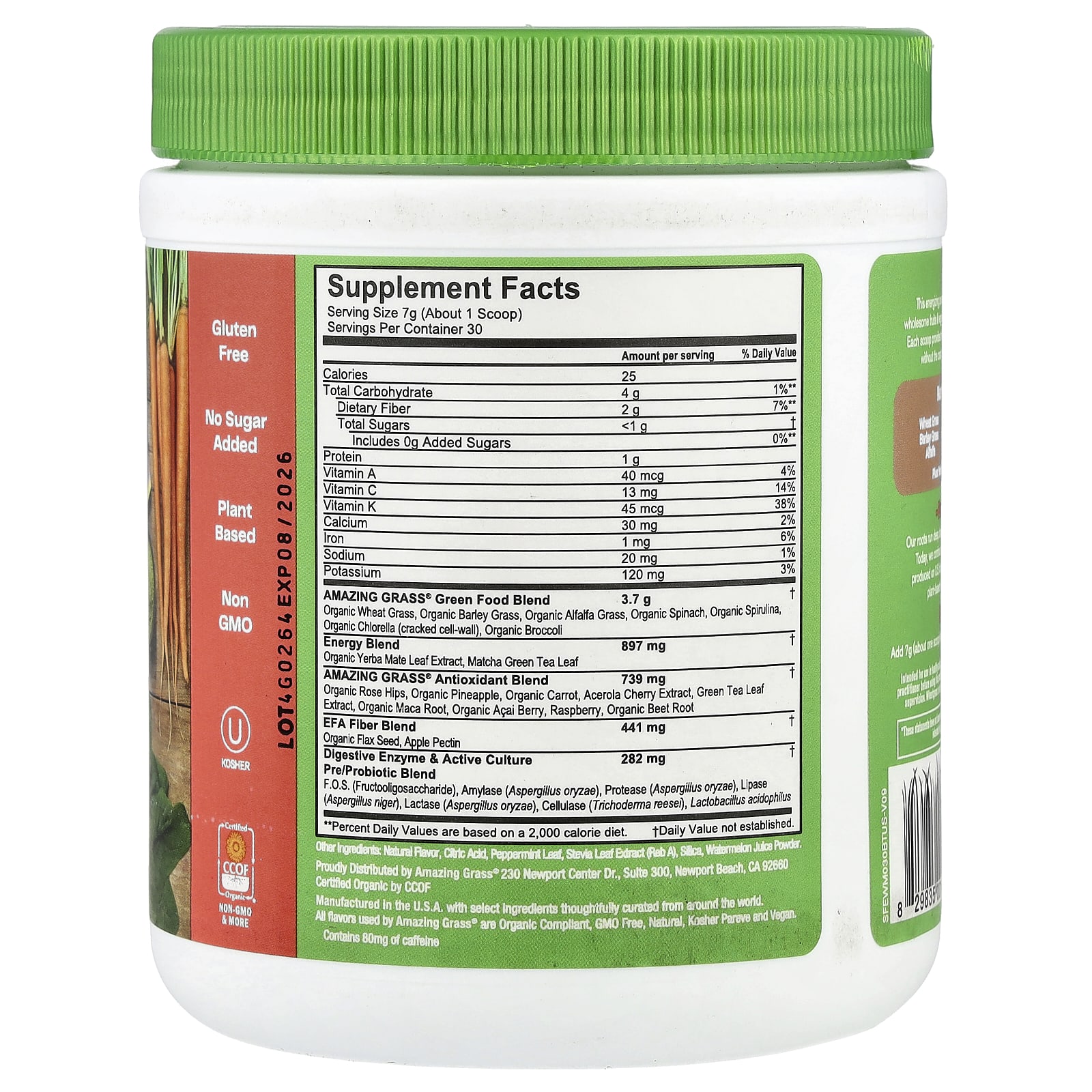 Plant-Based Caffeine 1 Serving Fruits & Veggies 7 Nutritious Greens Naturally Flavored Whole Food Dietary Supplement Natural EnergySupports ImmunitySupports Digestive Health Convenient Powder Gluten FreeNo Sugar Added Non GMO Kosher Certified Organic by CCOF WatermelonThis energizing powder blend combines nutritious greens and wholesome fruits & veggies plus caffeine from Yerba Mate & Green Tea. Each scoop provides the caffeine equivalent to about a cup of coffee, without the crash, to help you feel amazing every day.Nutrition Made Easy.Wheat Grass Barley Grass AlfalfaSpirulina Chlorella Broccoli SpinachBeet Root Carrot PineappleAcai Berry Raspberry Plus: Yerba Mate, Matcha Green Tea & MacaFarm Family Roots Our roots run deep, back to a 3rd generation family farm in Kansas. Today, we continue to use organically grown cereal grasses produced on U.S. family farms and craft them with high-quality plant-based ingredients from around the world. All flavors used by Amazing Grass® are Organic Compliant, GMO free, natural, kosher pareve and vegan.