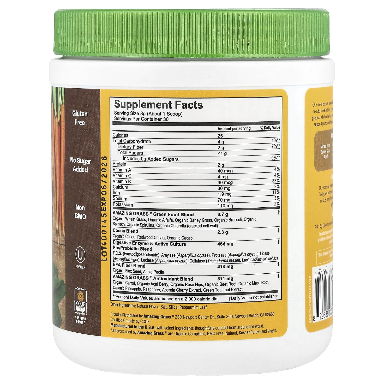Natural flavor, salt, silica, peppermint leaf.Manufactured in the U.S.A. with select ingredients thoughtfully curated from around the world.All flavors used by Amazing Grass® are organic complaint, GMO free, natural, kosher pareve and vegan.