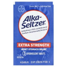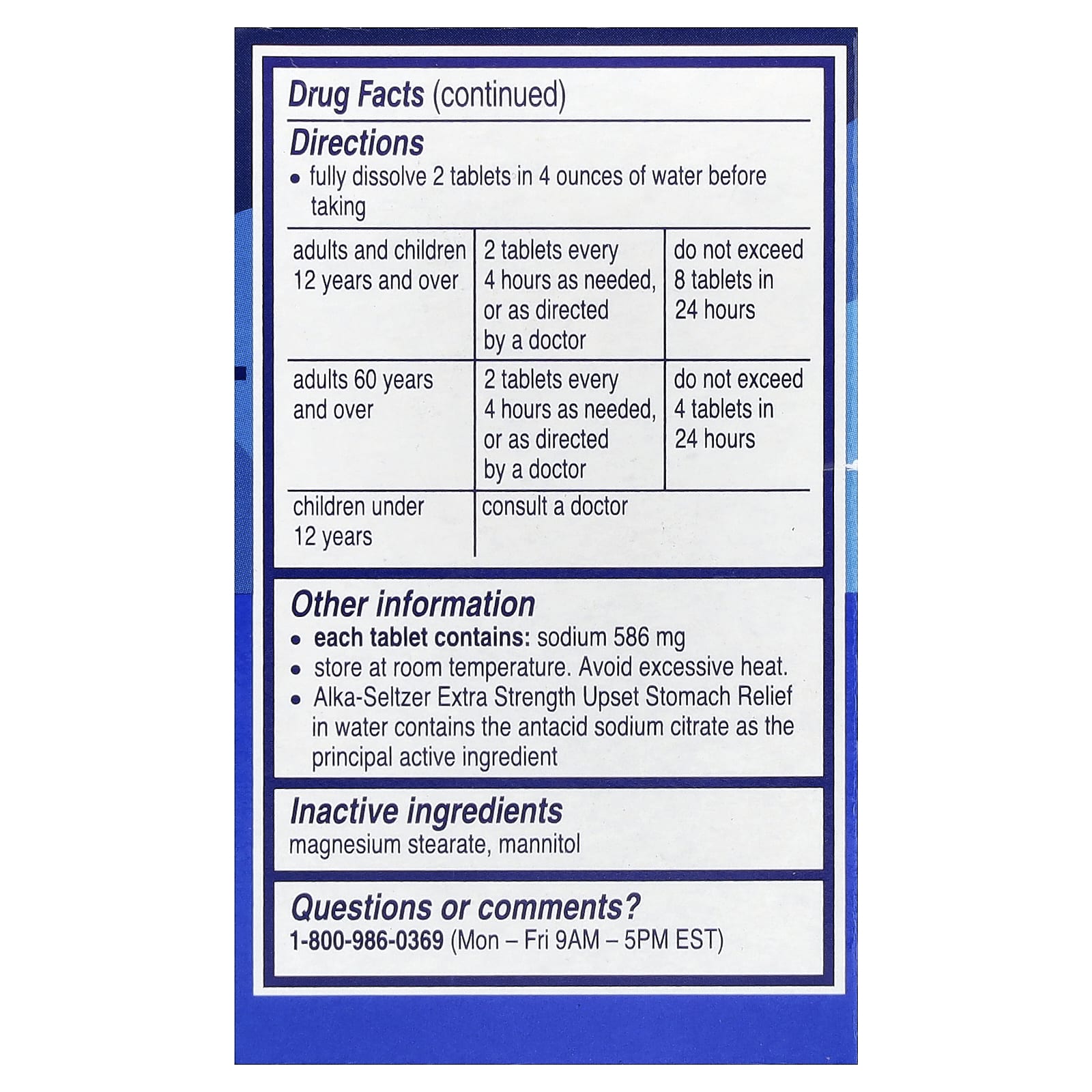 Fully dissolve two (2) tablets in 4 oz of water before taking. You do not have to drink any of the residue that may be on the bottom of the glass. The medicine of Alka-Seltzer® is in the water. Take Alka-Seltzer® Extra Strength Upset Stomach Relief at any time – morning, noon, or night – when you need relief from heartburn, acid indigestion, sour stomach and upset stomach.Adults and children 12 years and over2 tablets every 4 hours as needed, or as directed by a doctorDo not exceed 8 tablets in 24 hoursAdults 60 years and over2 tablets every 4 hours as needed, or as directed by a doctorDo not exceed 4 tablets in 24 hoursChildren under 12 yearsConsult a doctor