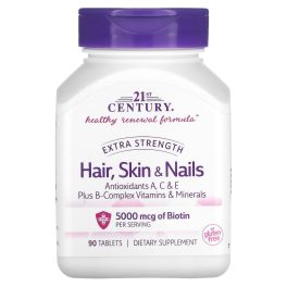 Extra StrengthHealthy Renewal Formula™With Antioxidants A, C & E, B-Complex Vitamins & Minerals5000 mcg of Biotin Per ServingDietary SupplementGluten FreeNon-GMOTrusted Quality for Over 30 YearsGuaranteed Quality Laboratory TestedDiscover Beautiful Support21st Century® Healthy Renewal Formula™ Extra Strength Hair, Skin & Nails works to help support your natural beauty from within. Biotin and Vitamins A, C, E are the nutrients needed to promote lustrous hair, strong nails and vibrant skin.Biotin is important for the maintenance of healthy skin and hair and supports nail growth.Vitamin A promotes a healthy cellular membrane for healthier skin and overall health.Vitamin C is an antioxidant that slows the rate of free-radical damage to the body.Vitamin E helps form red blood cells form and contributes to skin health.Use Hair, Skin & Nails to Support:Skin Moisture LevelThe Fullness of HairNail Strength & Health