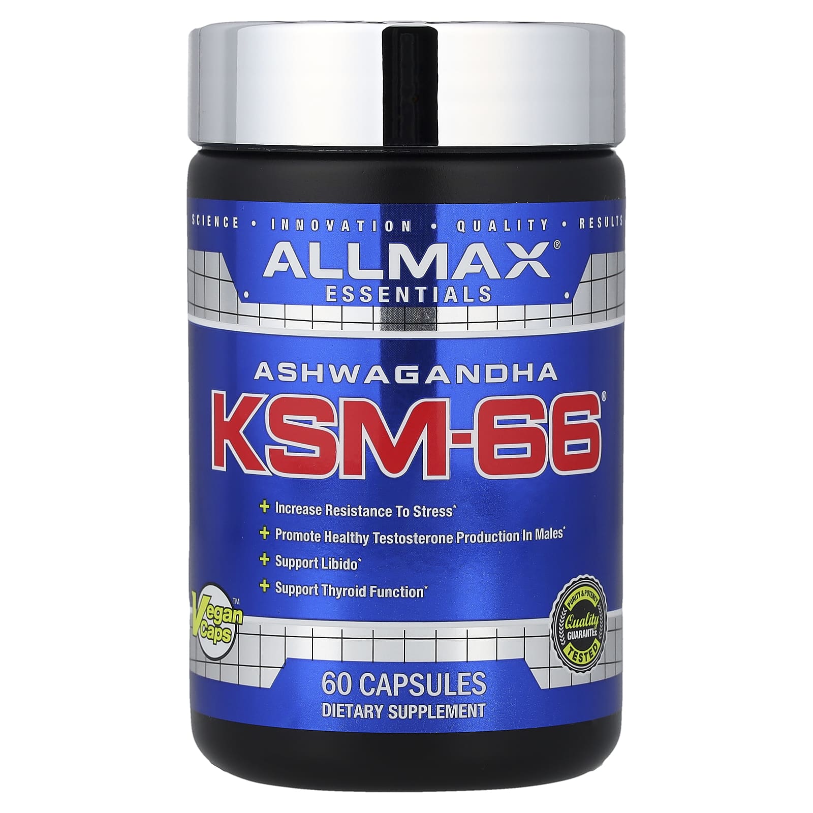 Science, Innovation, Quality, ResultsIncrease Resistance to StressPromote Healthy Testosterone Production in MalesSupport LibidoSupport Thyroid FunctionVegan Caps™Dietary SupplementPurity & Potency Tested – Quality GuaranteecGMP Registered FacilityGluten Free TestedNon GMOAllmax is pleased to introduce the newest member to our Essentials family Ashwagandha KSM-66. Ashwagandha is an evergreen shrub that is used to boost energy and reduce stress. Ashwagandha KSM-66 is the highest concentration, most bioavailable full-spectrum root extract available on the market today. It retains natural constituents of the herb in the original balance. It also has an extensive set of research studies and clinical trials.