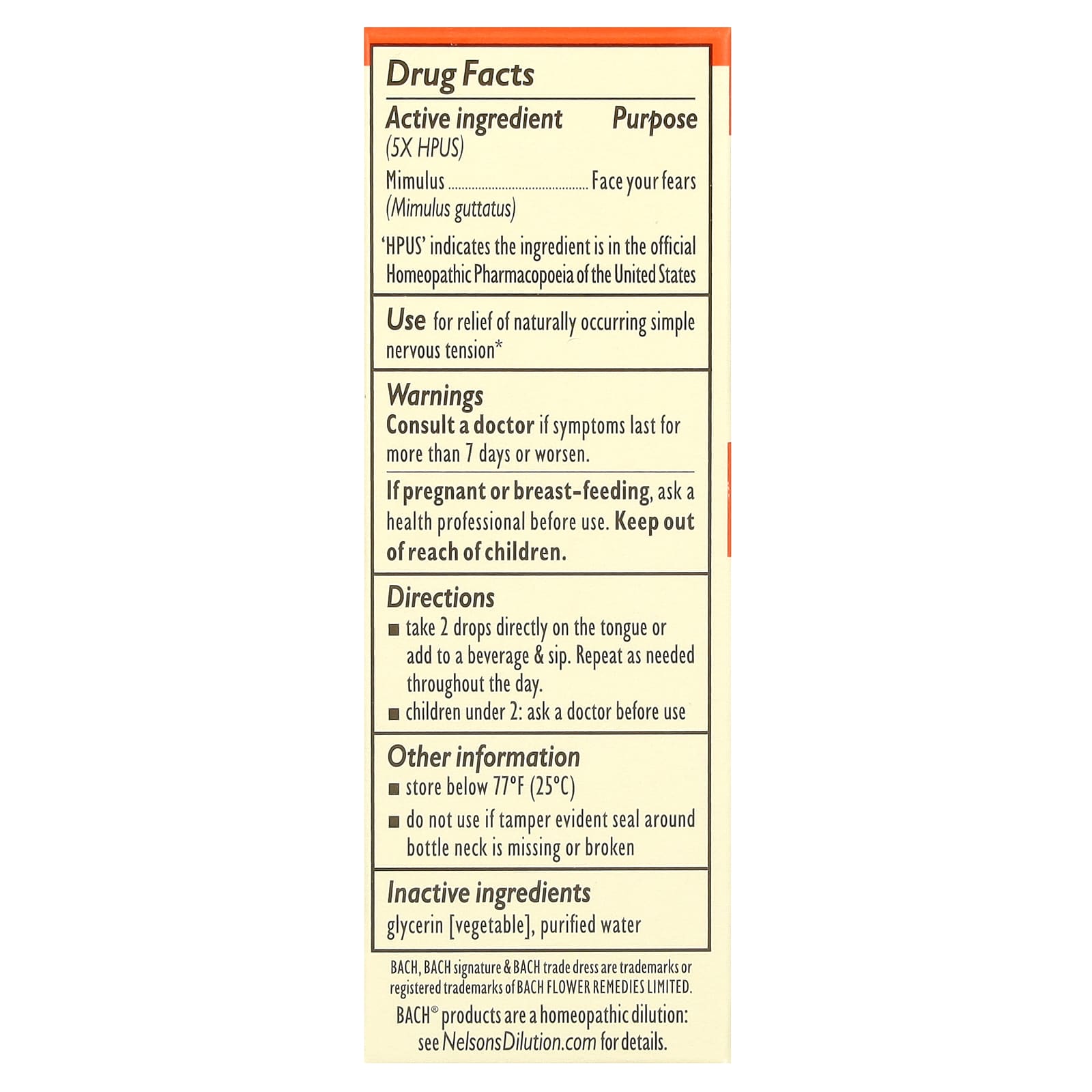 Vegan Non-Alcohol FormulaFace your FearsDropperHomeopathicMade in a FDA-Registered Pharmaceutical FacilityDr. Edward Bach developed the 38 flower remedies system to enhance wellbeing & ease distress from common emotional states. He believed Mimulus brings courage & calm when feeling fearful, worried, or timid.Use: for relief of naturally occurring simple nervous tension.