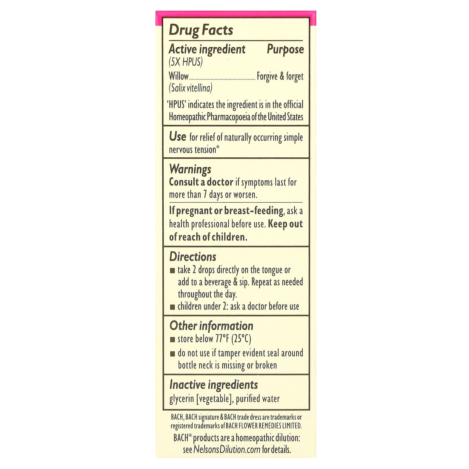 Vegan Non-Alcohol FormulaForgive & ForgetDropperHomeopathicMade in a FDA-Registered Pharmaceutical FacilityDr. Edward Bach developed the 38 flower remedies system to enhance wellbeing & ease distress from common emotional states. He believed Willow helps allow for forgiveness of past injustices, & to move on from feeling resentful or bitter.Use: for relief of naturally occurring simple nervous tension.
