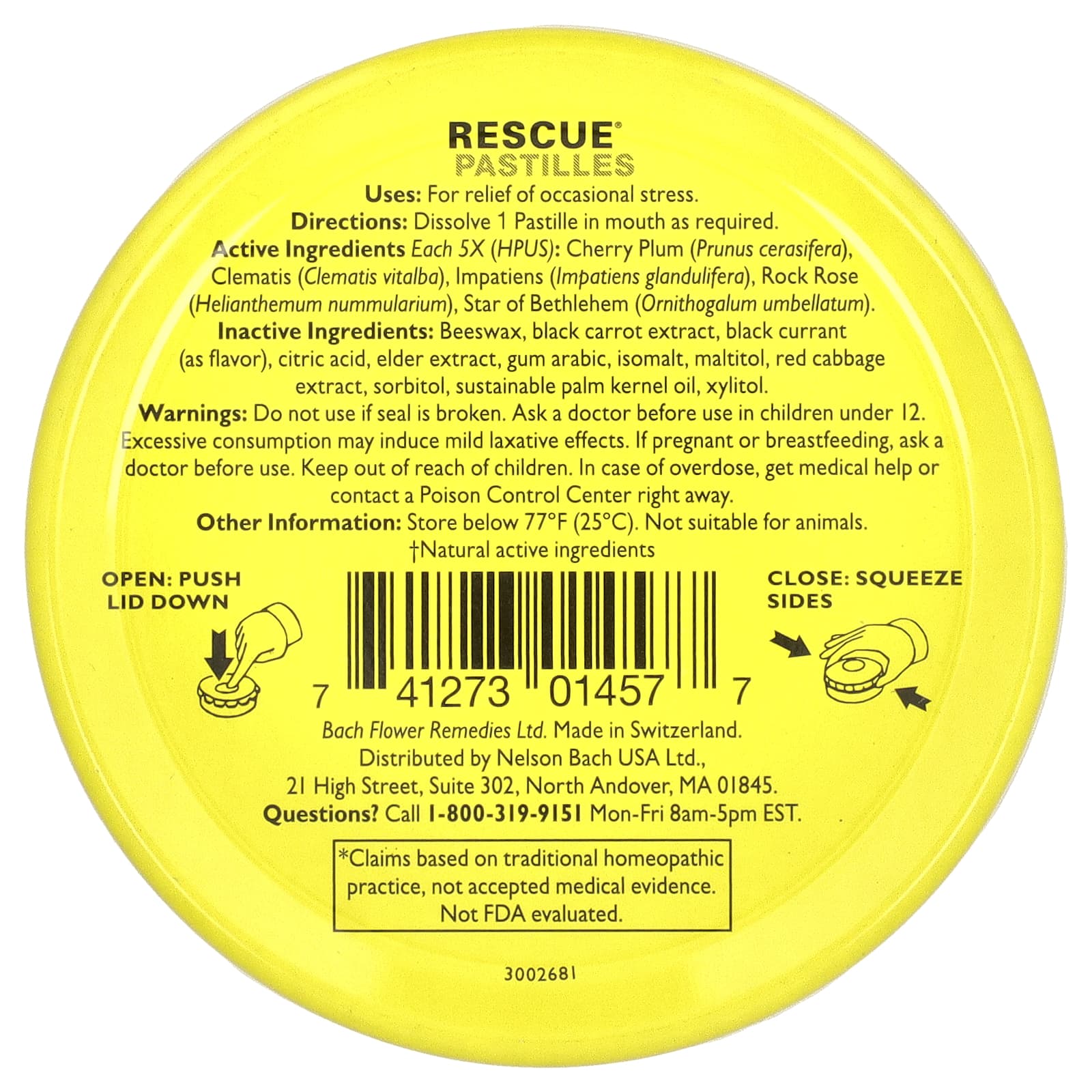 Active Ingredients: 5x (HPUS): Cherry plum (prunus cerasifera), clematis (clematis vitalba), impatiens (impatiens glandulifera), rock rose (helianthemum nummularium), star of bethelehem (ornithogalum umbellatum).Inactive Ingredients: Beeswax, black carrot extract, black currant (as flavor), citric acid, elder extract, gum arabica, isomalt, maltitol, red cabbage extract, sorbitol, sustainable palm kernel oil, xylitol.