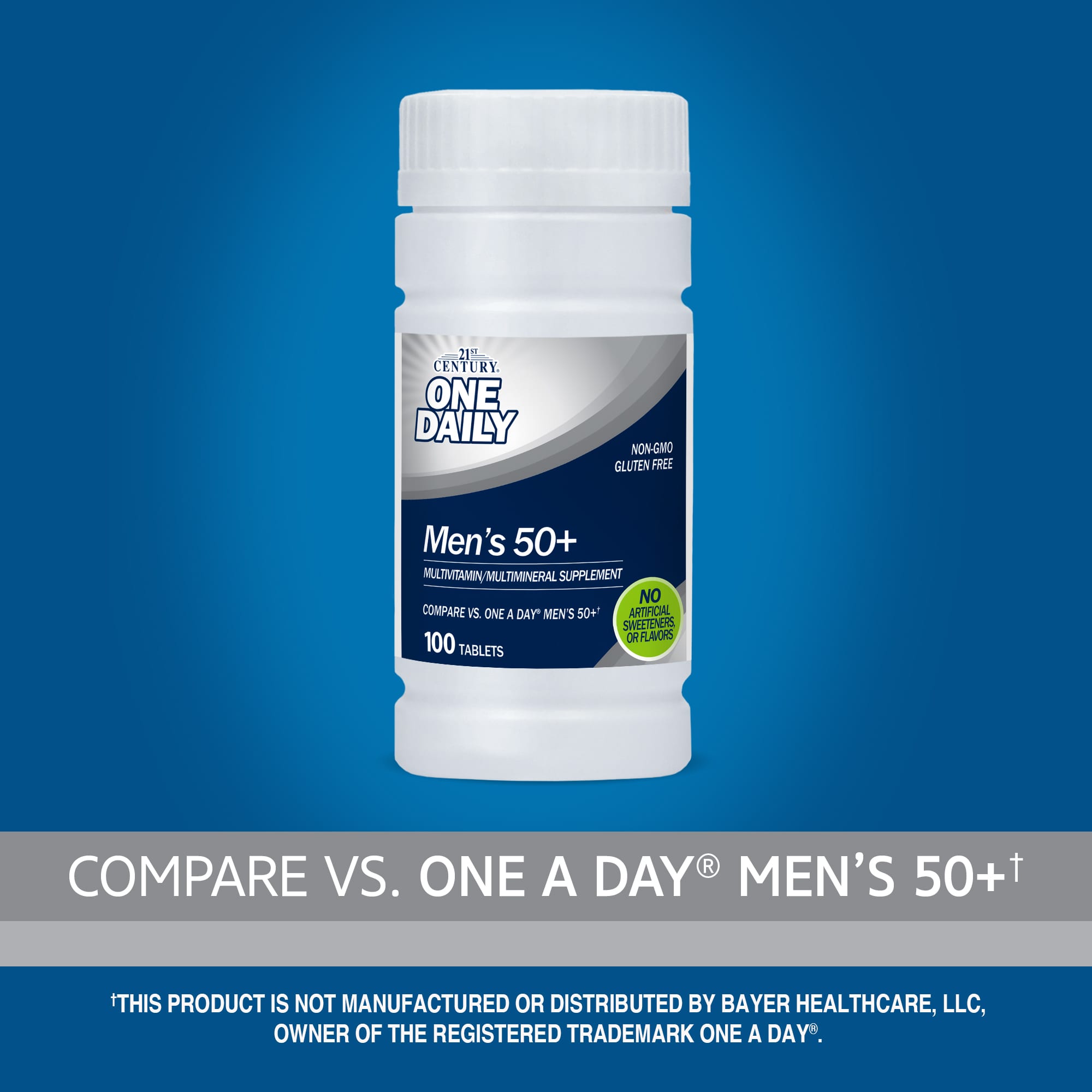 Non-GMOGluten FreeMultivitamin/Multimineral SupplementCompare vs. One A Day® Men’s 50+†No Artificial Sweeteners or FlavorsGuaranteed Quality Laboratory TestedTrusted Quality for Over 30 Years†This product is not manufactured or distributed by Bayer Health Care, LLC, owner of the registered trademark One A Day®.