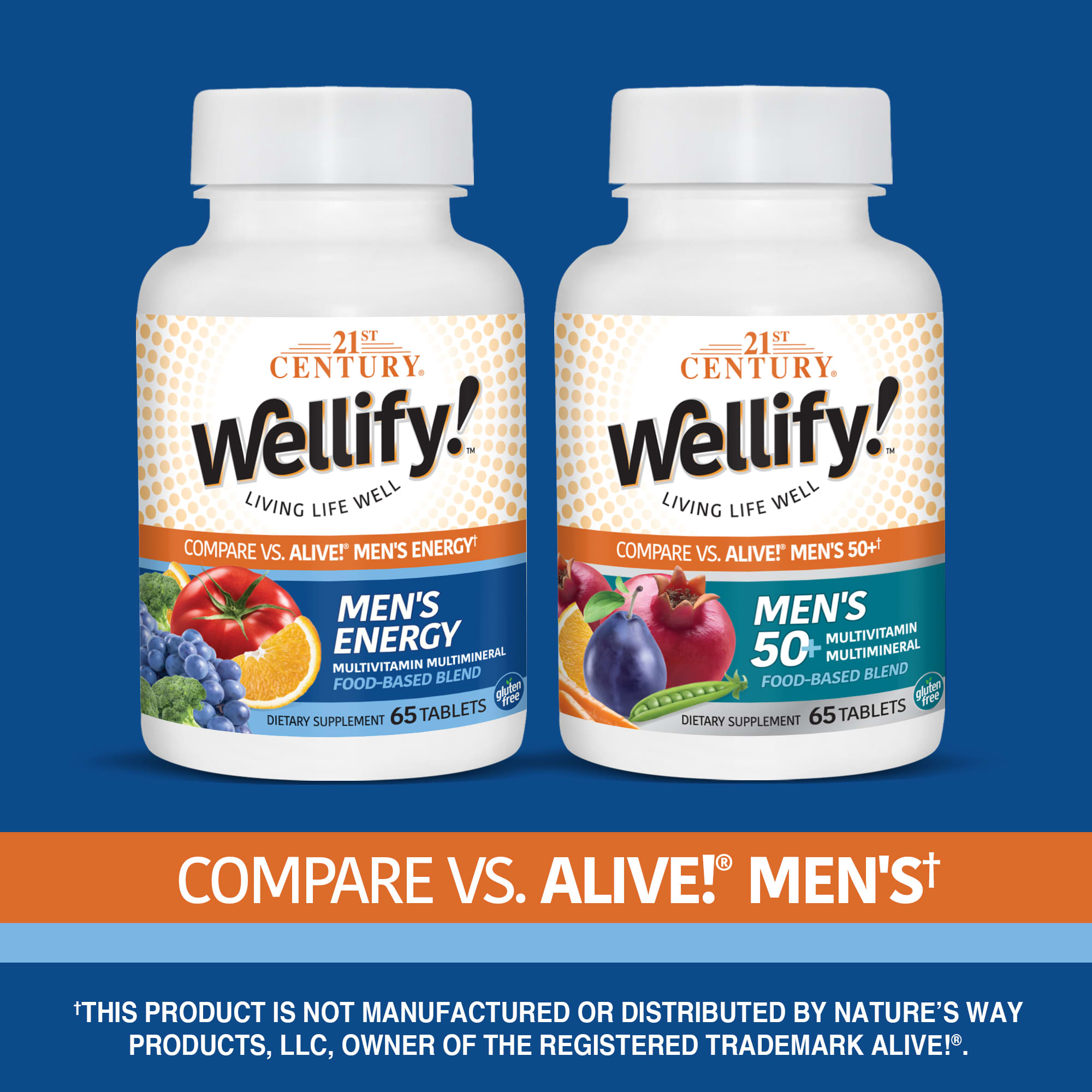 Living Life WellCompare VS. Alive!® Men’s EnergyFood-Based BlendDietary SupplementGluten FreeGuaranteed Quality Laboratory TestedTrusted Quality for Over 30 YearsLiving life with your health and wellness in mind is living life well!