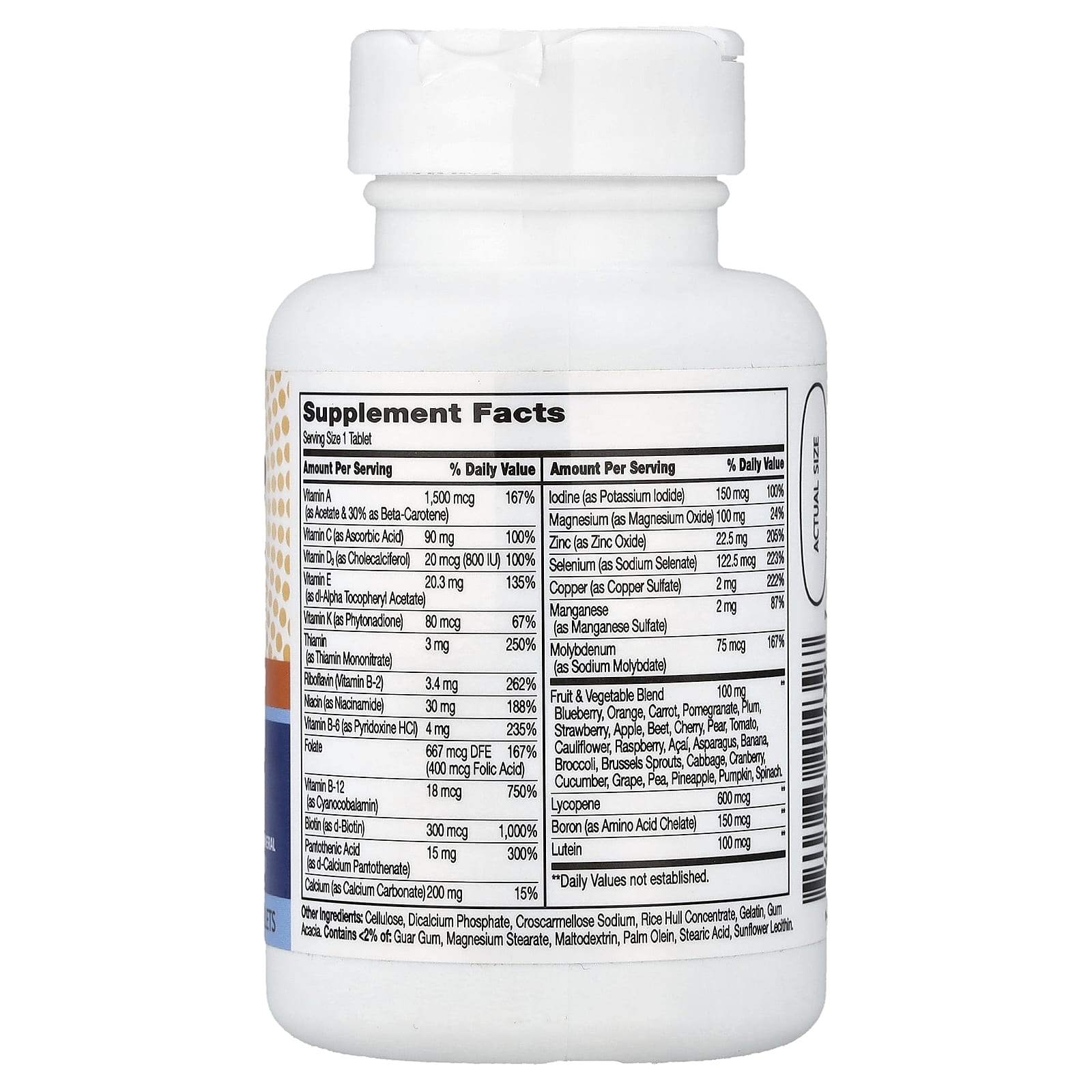 Cellulose, dicalcium phosphate, croscarmellose sodium, rice hull concentrate, gelatin, gum acacia. Contains <2% of: Guar gum, magnesium stearate, maltodextrin, palm olein, stearic acid, sunflower lecithin.No added yeast, artificial flavors or colors.