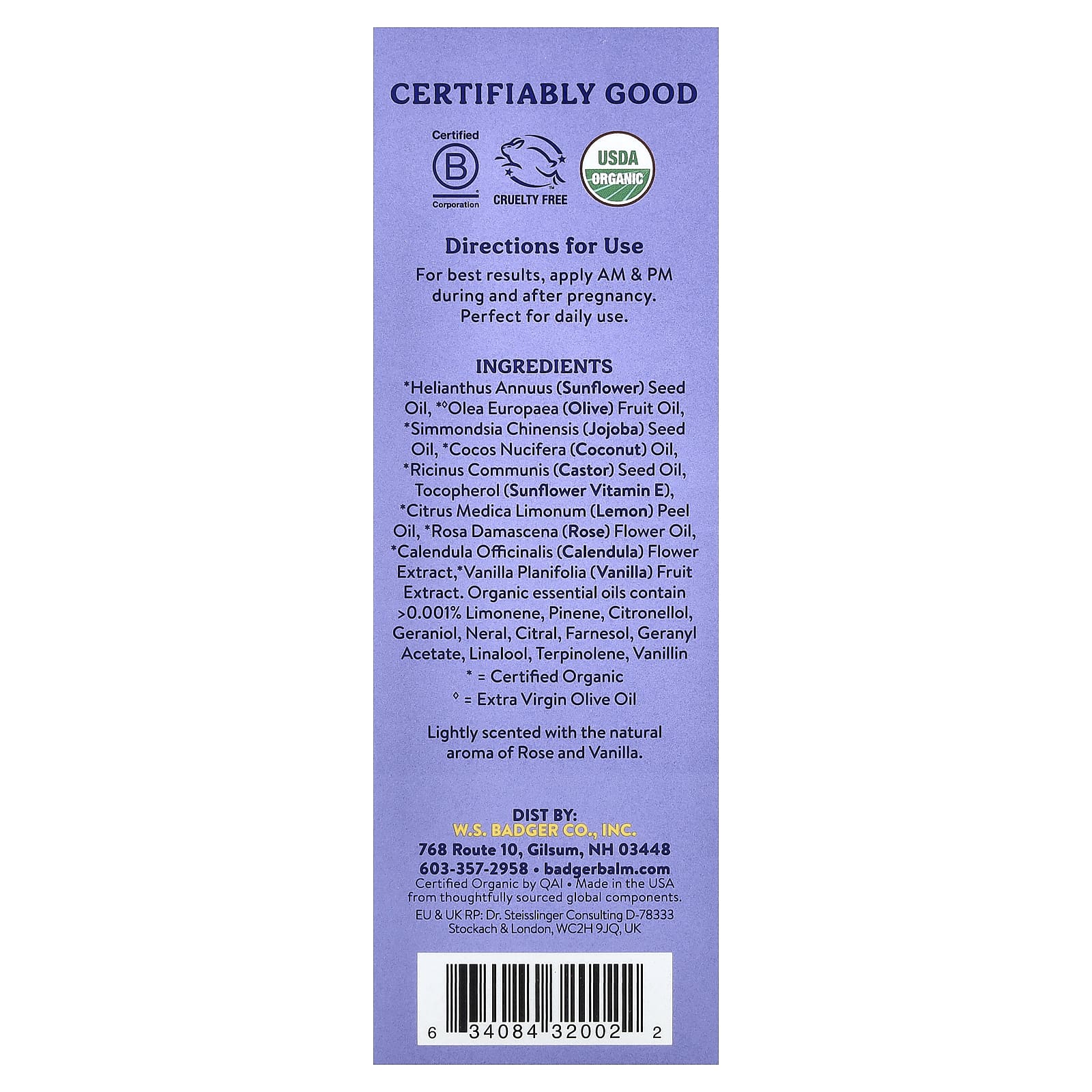 USDA OrganicDeeply Hydrates and Nourishes With Coconut & Jojoba OilEnhances Skin Elasticity with Vitamin ELightly ScentedSkin MoisturizingFamily FriendlyGluten FreeGentle FormulaCertifiably GoodCertified B CorporationLeaping Bunny®; Cruelty FreeCertified Organic by QAINourishing Belly Oil Help your skin through its beautiful evolution with this non-greasy blend of organic plant extracts and emollient-rich oils. Lightly scented with the natural aroma of Rose and Vanilla, it absorbs quickly and helps to moisturize and relieve dry, tight skin with mom-approved ingredients. Jojoba and Coconut deeply nourish while Sunflower and Calendula soften and soothe, leaving your skin feeling hydrated. Perfect for daily use. Hypoallergenic and suitable for all skin types.