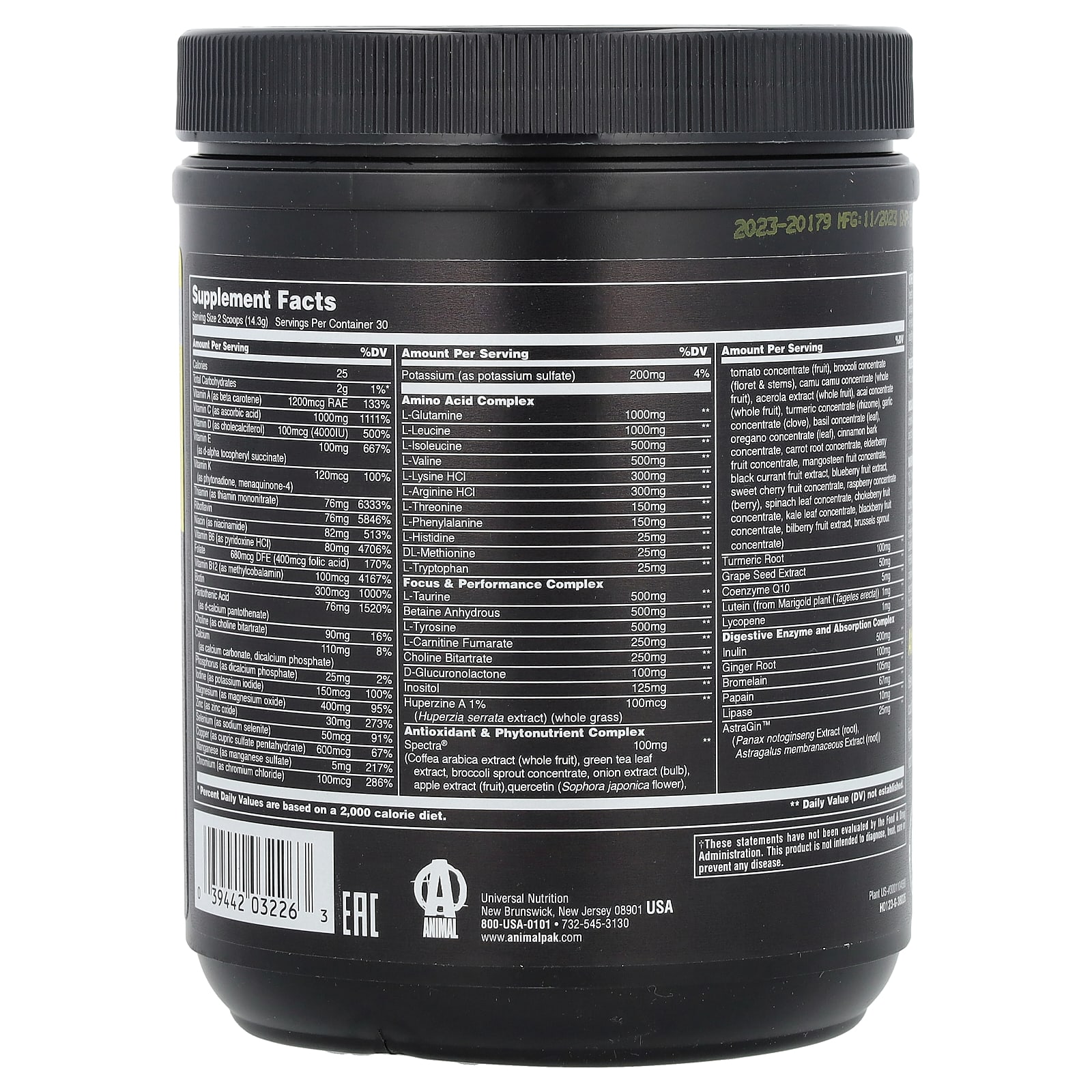 Great TasteHigh Performance All-In-1 Multi-Vitamin Cellular EnergyMuscle BuildingCognitive FunctionHealthy Liver FunctionAntioxidantsImmune HealthCardiovascular HealthMetabolismDigestionBioavailability & MorePowderDietary SupplementIronclad Quality & Guarantee – Commitment to ExcellenceEvery Batch is Third Party Laboratory TestedAnimal Pak®Beyond a conventional multivitamin, this curated blend goes above and beyond to fortify your body’s foundation and optimize fitness performance.The Ultimate Training Supplement For Those Who Are Built Not BornFormula with 36% More ServingsProviding 12 supplements in 1 and now delivering better performance with 85+ highly absorbable nutrients that enhances training sessions and boosts energy in daily life, now with 30 servings (60 scoops) per can.Essential Vitamins and Minerals for Daily Nutritional and Immune SupportOptimized nutritional values of to meet the daily vitamin, mineral and herb needs of athletes including Zinc, Vitamins C, B, D, plus EAA and BCAA Amino Acids, and more.Includes Scientifically Validated SPECTRA® AND ASTRAGIN™Spectra® is an all-natural blend of 29 fruits, vegetables, and herbs to help increase blood flow to muscles and support cellular energy through improved oxygen and Astragin™ helps improve nutrient absorption and bioavailability.Cost Effective, All In One ProductMore than a multivitamin, a comprehensive sports nutrition solution that costs less than buying individual supplements separately.