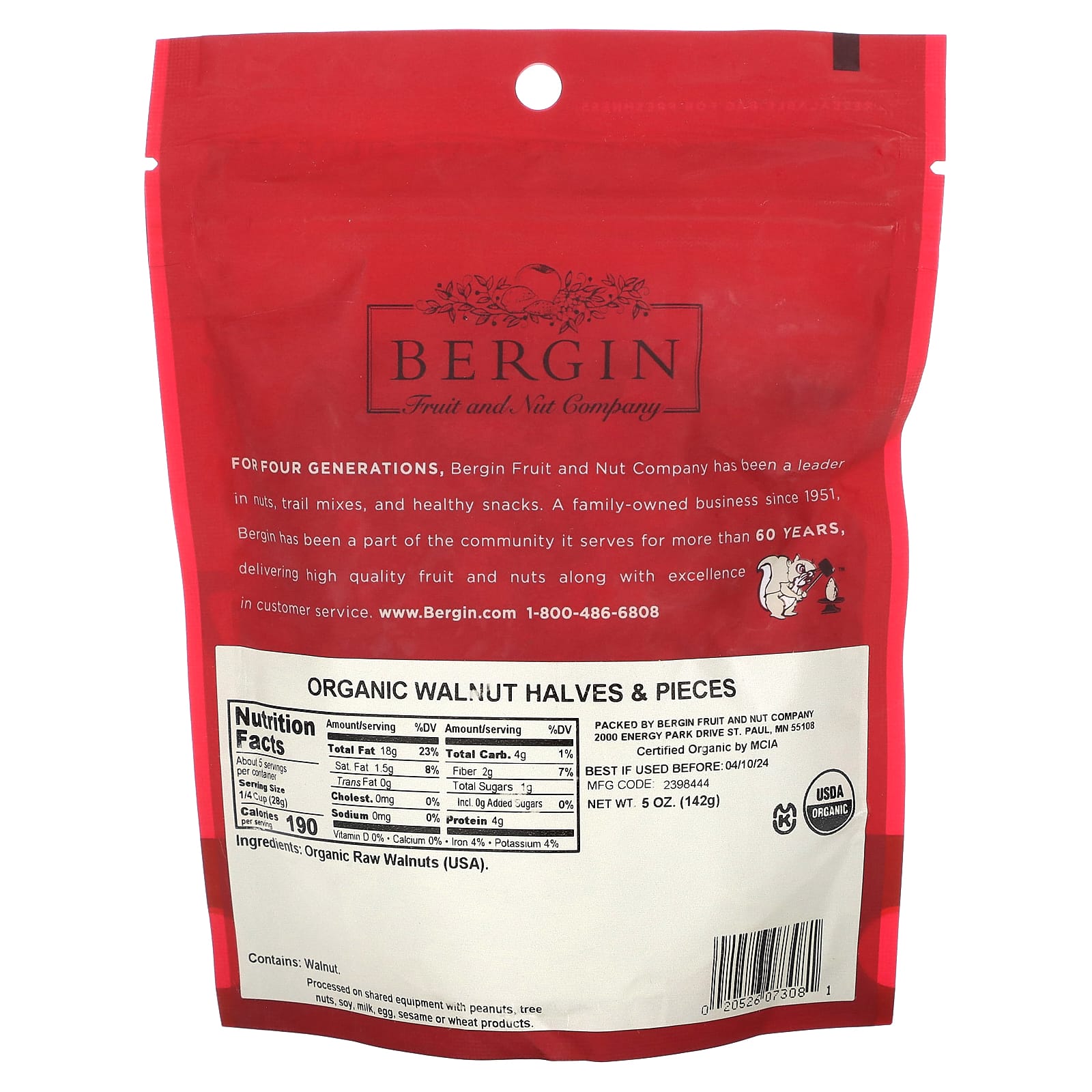 Resealable Bag for FreshnessThe Finest Nuts & Fruits Since 1951USDA OrganicKosherCertified Organic by MCIAFor Four Generations, Bergin Fruit and Nut Company has been a leader in nuts, trail mixes, and healthy snacks. A family-owned business since 1951, Bergin has been a part of the community it serves for more than 60 years, delivering high quality fruit and nuts along with excellence in customer service.
