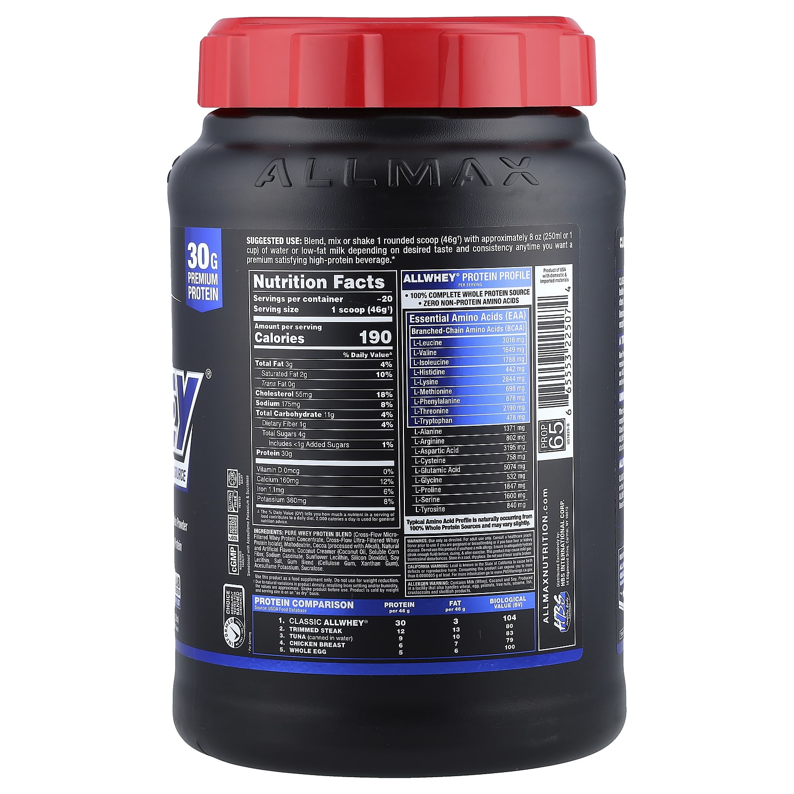 Clean For AthletesScience – Innovation – Quality – ResultsAM – PM – Pre/PostGreat Tasting Whey Protein Powder Exclusive Source: Whey Protein 30 g Premium Protein¹Gluten Free Tested Lab-Tested Every LotNatural & Artificial Flavors Informed Choice – We Test You TrustRegularly Tested on Banned SubstancescGMP Registered FacilityKosher DairySweetened with Acesulfame Potassium and SucraloseProtein ComparisonSource: USDA Food DatabaseProteinper 46 gFatper 46 gBiologicalValue (BV)1. Classic ALLWHEY®3031042. Trimmed Steak1213803. Tuna (canned in water)910834. Chicken Breast67795. Whole Egg56100Classic AllWhey®: All protein, all whey, no compromises, pure results!Classic AllWhey® is a premium Whey Protein Concentrate blended with Whey Protein Isolate delivering 30 g Protein in a 46 g serving; tested and guaranteed! AllWhey delivers a clean, complete and whole protein made from the best source; 100% Whey Protein!Demand pure Whey Protein, great taste and amazing value. Demand superior taste and exceptional protein. Demand Classic AllWhey®!A True, Pure Protein with Truly Premium TasteNew Premium CLASSIC AllWhey® is by far the best tasting AllWhey we’ve ever made! We tested over 50 versions and selected these truly amazing flavors. Using a completely new cutting-edge flavor technology, our AllWhey flavors will make you think you just had a freshly blended Ice Cream Milkshake. Easy to mix and even easier to drink, AllWhey fits your fit lifestyle!Unmatched ValueWhen you’re looking for a protein, you’re looking for the cleanest protein at the best price. Compare us to the competition, some are as low as 50% protein! Look at their serving size and total protein and do the math. Check their ingredients, others often contain inferior non-whey protein sources. AllWhey® stands head and shoulders above the competition delivering exceptional value with 30 g protein at a cost that will keep you smiling all the way to the gym!Allwhey®: because results matterCLASSIC AllWhey® is just that, it’s all whey! AllWhey has no inferior non-whey protein sources. It has zero non-protein aminos and every gram of protein claimed is a true protein! AllWhey delivers a premium quality whey protein to help rebuild your muscles after intense training. Research shows that higher protein levels post-workout help muscles recover faster. Better protein = better results!Unsurpassed: The Allmax® Quality GuaranteeEvery ingredient added and every lot produced is laboratory-tested for purity and potency to ensure consistent product quality and integrity every time, guaranteed.Clean for Athletes. Banned Substance Tested.This product has been skip-lot tested for banned substances for the assurance of athletes and supplement users under the Informed Choice program.¹Per Serving