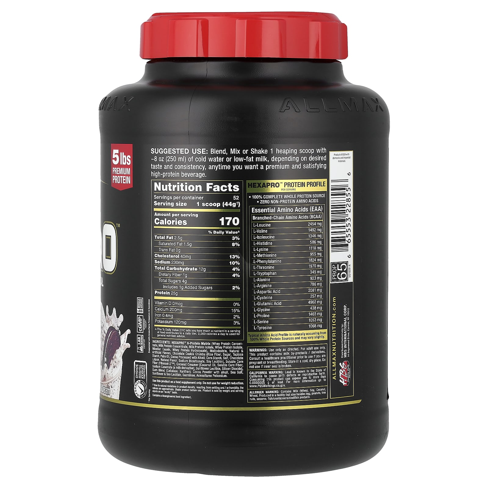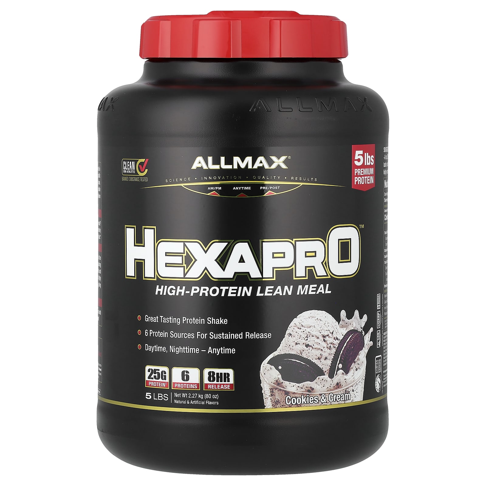 Clean for Athletes Banned Substance TestedScience – Innovation – Quality – ResultsAM/PM | Anytime | Pre/Post5 lbs Premium Protein Great Tasting Protein Shake 6 Proteins Sources for Sustained Release Daytime, Nighttime – Anytime25 g Protein¹ – 6 Proteins – 8 Hr ReleaseNatural & Artificial FlavorsInformed Choice – We Test, You TrustRegularly Tested for Banned SubstancesLab Tested – Every LotcGMP Registered Facility100% Whole Protein Source Sweetened with Acesulfame Potassium & SucraloseWhy Supplement with Hexapro™ ?As most hard-training athletes and fitness enthusiasts know, a critical factor involved in muscle recovery and growth is supplementing with the right amount of protein at specific times of the day. Hexapro™ is a high protein, lean meal solution to this protein timing issue. It’s formulated with 6 superior proteins to continuously feed your muscles with clean, whole protein at a steady, sustained rate. With its thick, milkshake-like texture, you won’t believe that you’re getting 25 g of pure protein with zero added sugar.Daytime No time for a full meal? Need to satisfy your hunger and get you to do that next full meal? Hexapro™ makes getting extra feedings into your schedule delicious and extremely convenient. Hexapro™ satisfies hunger & cravings without compromising your healthy diet.Nighttime The most neglected opportunity to repair and grow muscles is during sleep. Overnight is the longest period of time the body goes without protein intake. Research shows that consuming 20 g – 40 g of sustained release protein before bed stimulates muscle protein synthesis and limits muscle breakdown. Hexapro™ has been formulated with 6 of the best, most highly bioavailable proteins in an ideal ratio providing fast, medium and slow protein delivery, giving you an 8 hour sustained release of protein,while you sleep!Anytime Hexapro™ is the perfect sweet treat, without cheating on your diet! Add milk and blend with ice for a delicious high-protein milkshake. Don’t be a victim of unhealthy snacking again!Unsurpassed. The ALLMAX® Quality GuaranteeEvery ingredient added and every lot produced is independently lab tested for purity and potency ensuring consistent quality every time, guaranteed.This product has been skip-lot tested for banned substances for the assurance of athletes and supplement users under the Informed Choice program.¹Per serving