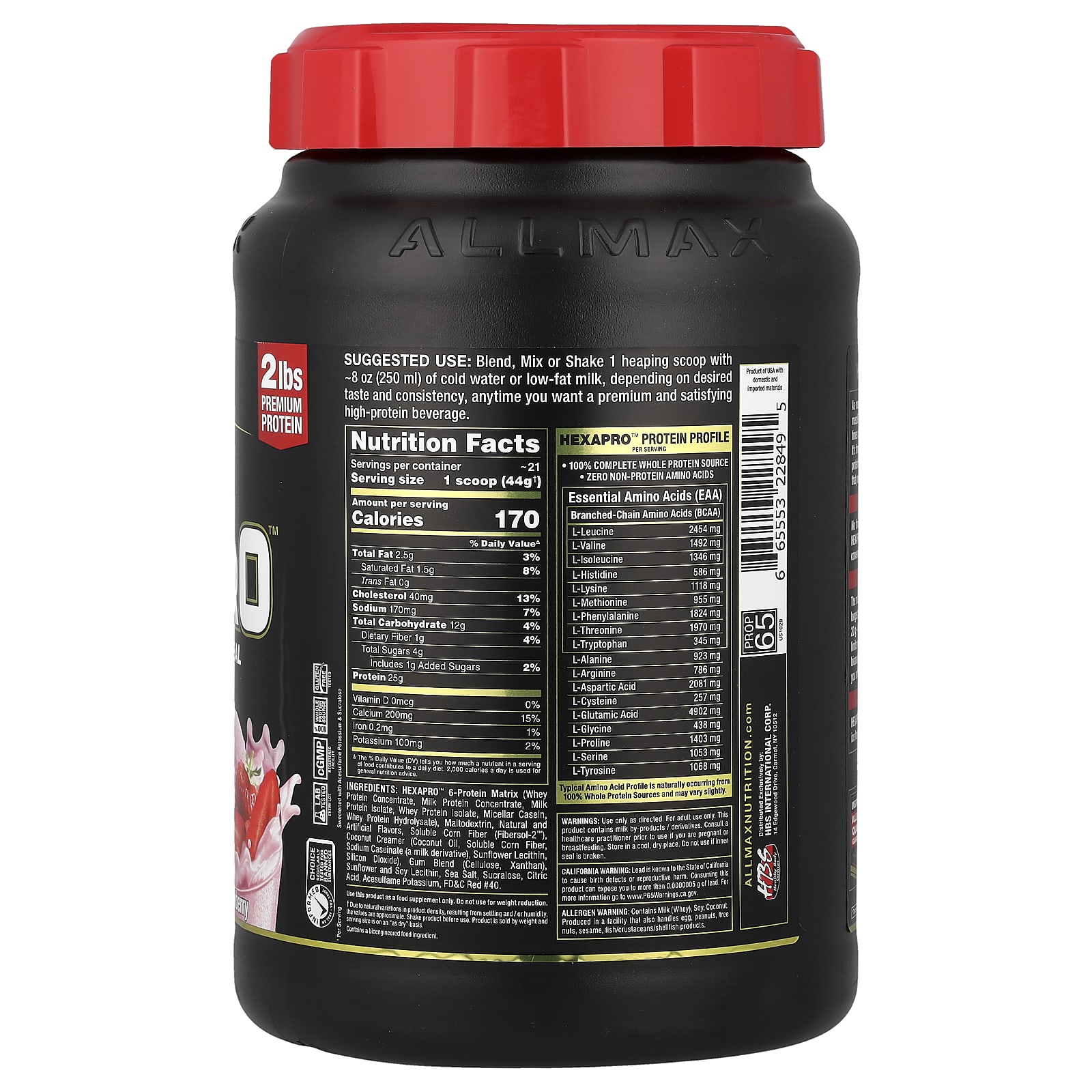 Clean For AthletesBanned Substance TestedScience – Innovation – Quality – ResultsAM/PM | Anytime | Pre/Post2 lbs Premium Protein Great Tasting Protein Shake 6 Proteins Sources for Sustained Release Daytime, Nighttime – Anytime25 g Protein¹8 Hr ReleaseNatural & Artificial FlavorsInformed-Choice We Test You TrustRegularly Tested For Banned SubstancesLab Tested – Every LotcGMP Registered Facility100% Whole Protein Source Gluten Free TestedSweetened with Acesulfame Potassium & SucraloseWhy Supplement with Hexapro™ ?As most hard-training athletes and fitness enthusiasts know, a critical factor involved in muscle recovery and growth is supplementing with the right amount of protein at specific times of the day. Hexapro™ is a high protein, lean meal solution to this protein timing issue. It’s formulated with 6 superior proteins to continuously feed your muscles with clean, whole protein at a steady, sustained rate. With its thick, milkshake-like texture, you won’t believe that you’re getting 25 g of pure protein with zero added sugar.Daytime No time for a full meal? Need to satisfy your hunger and get you to do that next full meal? Hexapro™ makes getting extra feedings into your schedule delicious and extremely convenient. Hexapro™ satisfies hunger & cravings without compromising your healthy diet.NighttimeThe most neglected opportunity to repair and grow muscles is during sleep. Overnight is the longest period of time the body goes without protein intake. Research shows that consuming 20 g – 40 g of sustained release protein before bed stimulates muscle protein synthesis and limits muscle breakdown. Hexapro™ has been formulated with 6 of the best, most highly bioavailable proteins in an ideal ratio providing fast, medium and slow protein delivery, giving you an 8 hour sustained release of protein,while you sleep!Anytime Hexapro™ is the perfect sweet treat, without cheating on your diet! Add milk and blend with ice for a delicious high-protein milkshake. Don’t be a victim of unhealthy snacking again!Unsurpassed. The ALLMAX® Quality GuaranteeEvery ingredient added and every lot produced is independently lab tested for purity and potency ensuring consistent quality every time, guaranteed.This product has been skip-lot tested for banned substances for the assurance of athletes and supplement users under the Informed Choice program.¹Per Serving