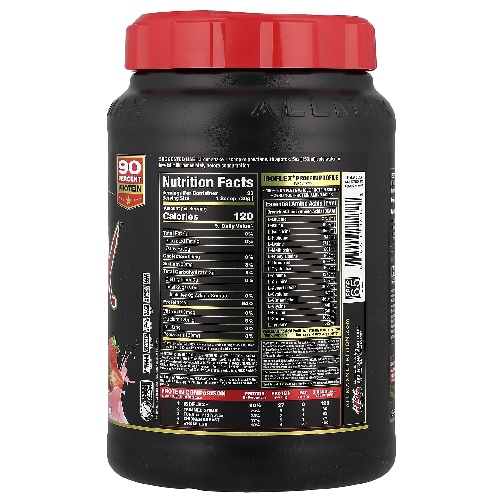 Clean for Athletes – Banned Substance TestedScience – Innovation – Quality – ResultsAM / PM – Anytime – Pre / Post90 Percent ProteinTruly Superior Protein TechnologyContains No Gluten, No Soy, No Added Sugar♢Lab Tested & Certified, Guaranteed27 g Protein¹ – 10 g Sugars¹♢ – 120 Calories¹Natural & Artificial FlavorsInformed-Choice We Test, You TrustRegularly Tested for Banned SubstancesLab Tested- Every LotcGMP Registered FacilityGluten Free TestedKosher Dairy100% Whole Protein SourceSoy-FreeIsoflex®: Truly Superior ProteinIsoflex® has taken WPI technology to a whole new level of measurable superiority. Isoflex® is significantly lower in lacrose, fat, sugar and carbs, compared to regular WPIs. If you’re looking for the highest quality, most premium and fastest absorbing protein, then look no further than ISOFLEX®, a Truly Superior Whey Protein Isolate.In just about every way a protein can be, Isoflex® is Truly Superior.What does this mean to you?A 100% Whey Protein Isolate SourceNative & Intact, Non-Denatured Whey Protein FractionsLaboratory-Tested, Certified & Approved 27 g Pure Protein in Every ServingHybrid Ratio Isolate – (HRI)Ion-Filtration TechnologyIsoflex® employs a unique protein extraction technology called HRI. A hybrid of two isolate purification technologies incorporated at a specific ratio to produce a truly superior ultra-pure whey protein isolate. Cutting-Edge Hybrid-Ratio Ion-Filtration (HRI) Technology allows Isoflex to retain an exceptionally high protein yield while maintaining enhanced bioactive whey fractions. Isoflex contains absolutely no whey concentrate. Concentrates have higher levels of fat and sugars with a lower percentage of protein and lower bioavailability than Isolates. While other brands use Concentrates, Isoflex users know that Isolates have a superior protein percentage and won’t settle for non-isolate blends.Bioactive Full-Spectrum Whey Protein Isolate FractionsTruly Superior Protein53.8%Beta-Lactoglobulin20.3%Alpha-Lactalbumin18.8%Glycomacropeptide4.3%Bi-Peptides & Tri-Peptides2.5%Immunoglobulin1.6%Bovine Serum Albumin0.1%LactoferrinValues are typicalUnsurpassed The AllMax® Quality GuaranteedEvery ingredient added and every lot produced is laboratory-tested for purity and potency to ensure consistent product quality and integrity every time, guaranteed.Clean for Athletes – Banned Substance TestedThis product has been skip-lot tested for banned substances for the assurance of athletes and supplement users under the Informed Choice program.Protein ComparisonSource: USDA Food DatabaseProtein By PercentageProtein Per 30 gFat Per 30 gBiological Value (BV)1. Isoflex®90%2701202. Trimmed Steak29%91803. Tuna (canned in water)23%71834. Chicken Breast17%51795. Whole Egg13%43100♢Not a low calorie food. See nutritional panel for more information.¹Per Serving.