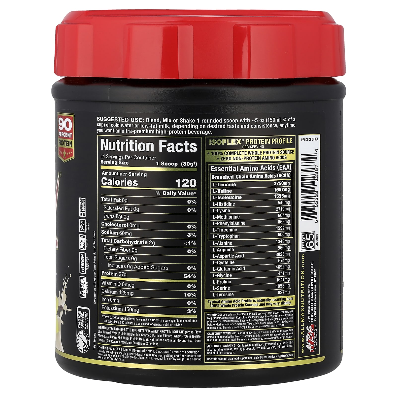 Clean For Athletes – Banned Substance Tested90 Percent ProteinScience – Innovation – Quality – ResultsAM / PM – Anytime – Pre / PostTruly Superior Protein TechnologyContains No Gluten, No Added Sugar♢Lab Tested & Certified, Guaranteed27 g Protein¹ 0 g Sugars¹♢ 120 Calories¹Natural & Artificial FlavorsInformed Choice – We Test, You Trust – Regularly Tested for Banned SubstancesLab Tested Every LotcGMP Registered FacilityGluten Free TestedKosher Dairy100% Whole Protein Source – Native & Intact Non DenaturedSweetened with Acesulfame Potassium & SucraloseISOFLEX®: Truly Superior ProteinIsoflex® has taken WPI technology to a whole new level of measurable superiority. If you’re looking for the highest quality, most premium and fastest absorbing protein, then look no further than Isoflex®; a Truly Superior Whey Protein Isolate. In just about every way a protein can be, Isoflex® Is Truly Superior.What Does This Mean To You?A 100% Whey Protein Isolate SourceNative & Intact, Non-Denatured Whey Protein FractionsLaboratory-Tested, Certified & Approved 27 g Pure Protein in Every ServingHybrid Ratio Isolate (HRI) lon-Filtration Technology Isoflex® employs a unique protein extraction technology called HRI. A hybrid of two isolate purification technologies incorporated at a specific ratio to produce a truly superior ultra-pure Whey Protein Isolate. Cutting-Edge Hybrid-Ratio lon-Filtration (HRI) Technology allows Isoflex to retain an exceptionally high protein yield while maintaining enhanced bioactive whey fractions (chart on right). Isoflex contains absolutely NO Whey Concentrate. Concentrates have higher levels of fat and sugars with a lower percentage of protein and lower bioavailability than Isolates. While other brands use Concentrates, Isoflex users know that Isolates have a superior protein percentage and won’t settle for non-Isolate blends.Bioactive Full-Spectrum Whey Protein Isolate FractionsTruly Superior Protein53.8%Beta-Lactoglobulin20.3%Alpha-Lactalbumin18.8%Glycomacropeptide4.3%Bi-Peptides & Tri-Peptides2.5%Immunoglobulin1.6%Bovine Serum Albumin0.1%LactoferrinValues as typicalUnsurpassed The AllMax® Quality GuaranteedEvery ingredient added and every lot produced is laboratory-tested for purity and potency to ensure consistent product quality and integrity every time, guaranteed.Clean for Athletes – Banned Substance TestedThis product has been skip-lot tested for banned substances for the assurance of athletes and supplement users under the Informed Choice program.♢Not a low calorie food. See nutritional panel for more information.¹Per Serving