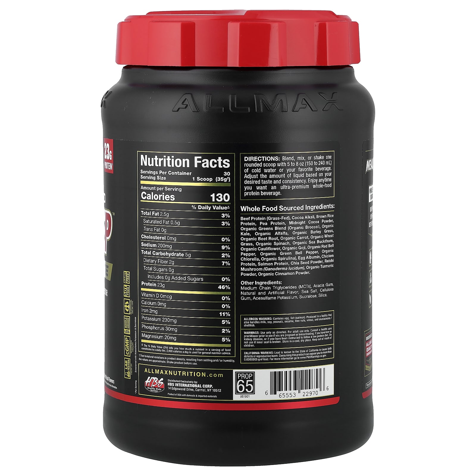 Whoe food sourced ingredients: Beef protein (grass-fed), cocoa alkali, brown rice protein, pea protein, midnight cocoa powder, organic greens blend (organic broccoli, organic kale, organic alfalfa, organic barley grass, organic beet root, organic carrot, organic wheat grass, organic spinach, organic sea buckthorn, organic cauliflower, organic goji, organic red bell pepper, organic green bell pepper, organic chlorella, organic spirulina), egg albumin, chicken protein, salmon protein, chia seed powder, reishi mushroom (ganoderma lucidum), organic turmeric powder, organic cinnamon powder. Other Ingredients: Medium chain triglycerides (mcts), acacia gum, natural and artificial flavor, sea salt, cellulose gum, acesulfame potassium, sucralose, silica.Allergen warning: Contains egg, fish (salmon). Produced in a facility that also handles milk, soy, peanuts, sesame, tree nuts, wheat, and crustaceans/shellfish.Product of USA with domestic & imported ingredients.