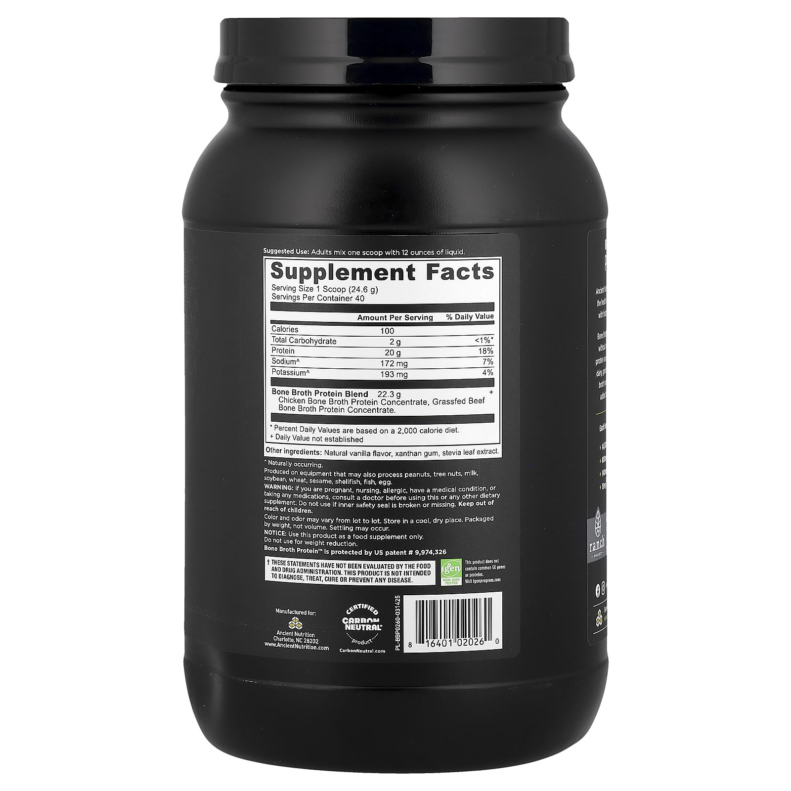 20 g Protein Per ServingSupports a Healthy Gut and JointsWhole Food Dietary SupplementSkinJointsPatented FormulaDairy FreeCertified Carbon Neutral® ProductIgen™ Non-GMO TestedAncient Nutrition has one goal-to transform the health of every individual on the planet with history’s most powerful superfoods. Bone Broth Protein is Paleo friendly, made without common allergens and the ideal protein source for those who are sensitive to dairy, grains, eggs, nuts, and legumes. Bone broth made easy! Great in smoothies or added to your favorite sweet recipes. Each Serving Contains Approximately: 14,500 mg Collagen 800 mg Chondroitin 140 mg Hyaluronic Acid 15 mg Glucosamine
