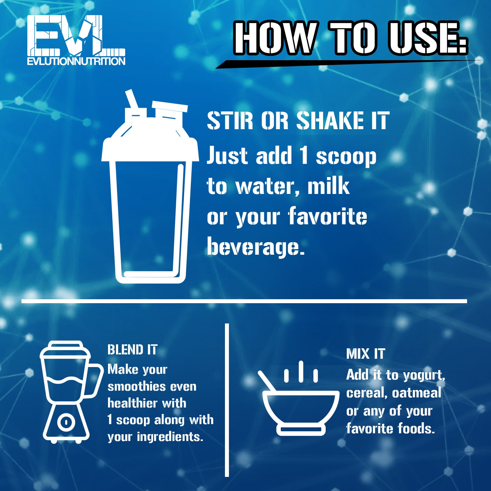Take 1-3 servings anytime of day to meet your daily protein requirements. On training days, consume before and/or after workouts to support muscle recovery, repair, and growth.Add 1 scoop of 100% Whey to 6 oz of your favorite liquid such as water, skim milk or unsweetened almond milk. Stir with a spoon or shake in a cup for 15-20 seconds until protein powder fully dissolves.Stir or Shake ItJust add 1 scoop to water, milk or your favorite beverage.Blend ItMake your smoothies even healthier with 1 scoop along with your ingredients.Mix ItAdd it to yogurt, cereal, oatmeal or any of your favorite foods.