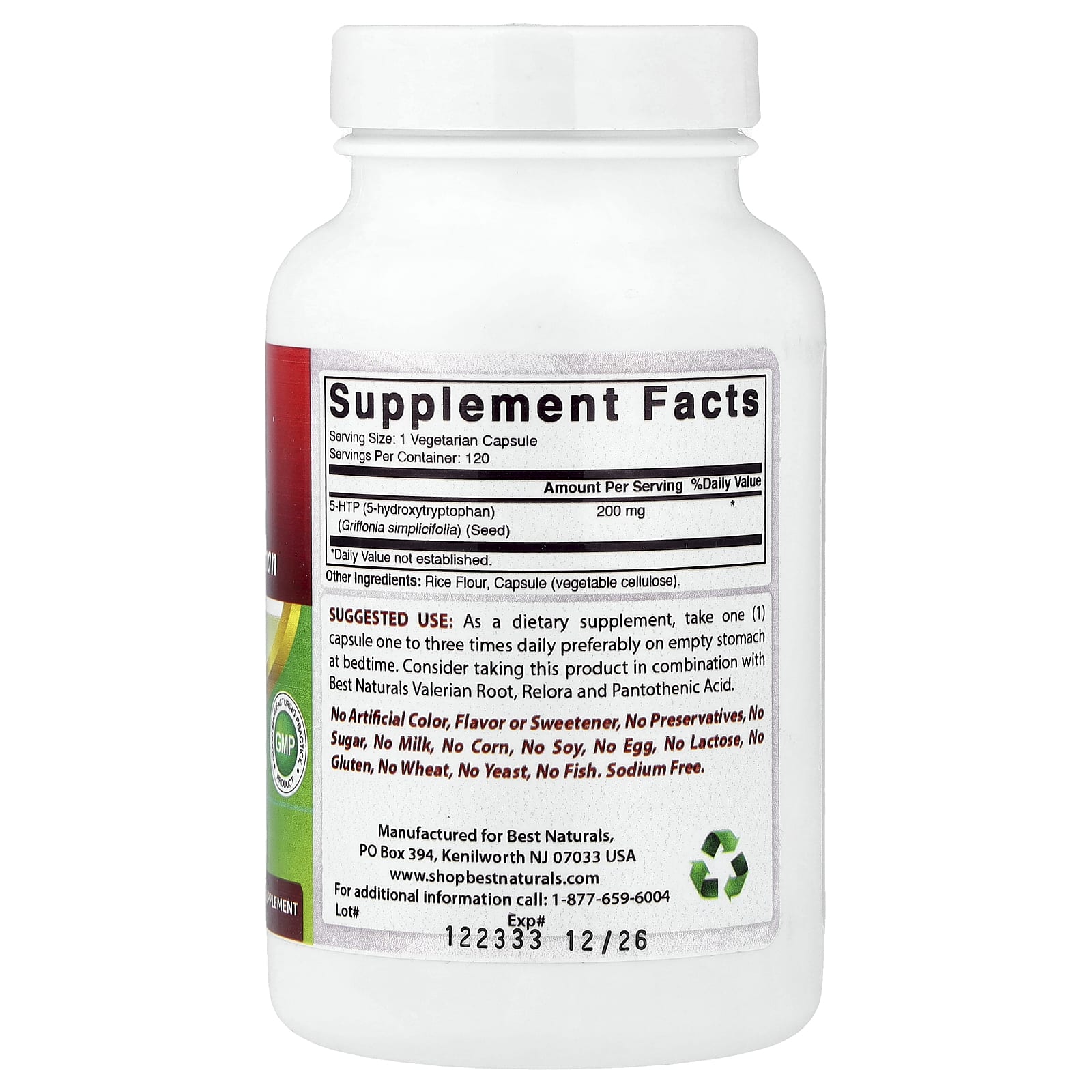 5-HydroxytryptophanPremium FormulaGMP – Good Manufacturing Practice Product3rd Party Lab TestedDietary SupplementSodium Free5-HTP is a drug-free plant-derived source of an amino acid from the seeds of Griffonia simplicifolia plant that naturally increases the body’s level of serotonin, the chemical messenger that affects emotions, behavior, appetite, thought and sleep. Certain research publications indicate that 5-HTP may help support the following:Supports relaxation and restful sleep.Supports appetite control.Supports positive mood.