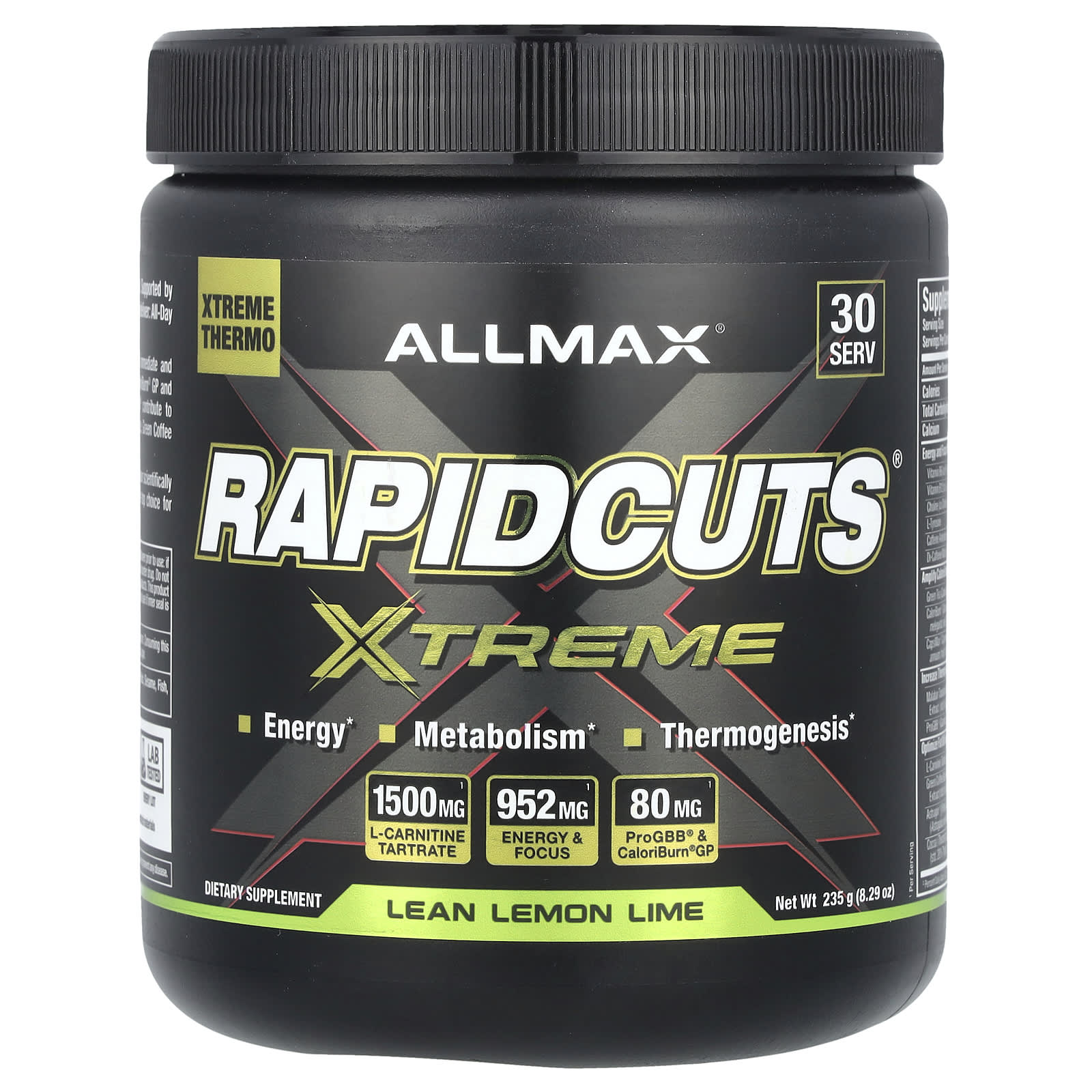 Xtreme ThermoEnergyMetabolismThermogenesis1500 mg L-Carnitine Tartrate¹952 mg Energy & Focus¹80 mg ProGBB® & CaloriBurn® GPDietary SupplementcGMP Registered FacilityClean LabelLab Tested Every LotRapidcuts® Xtreme represents the best-in-class for fat oxidation. Supported by undeniable scientific evidence, Rapidcuts® Xtreme was formulated to deliver: All-Day Energy, Efficient Fat Utilization, and Comprehensive Metabolic Support. Utilizing the latest scientific innovation, Rapidcuts® Xtreme combines immediate and sustained-release caffeine for all day energy. The inclusion of patented CaloriBurn® GP and CapsiMax® amplifies calorie burn, while Garcinia Cambogia and ProGBB® contribute to increased thermogenesis. The formula also incorporates L-Carnitine Tartrate, Green Cofee Bean, Theobromine, and patented Astragin® to optimize fat utilization.With a diverse profile encompassing 15 meticulously chosen ingredients and four scientifically formulated matrices, Rapidcuts® Xtreme from Allmax® stands as the top choice for athletes seeking rapid and efficient fat oxidation.¹Per Serving.