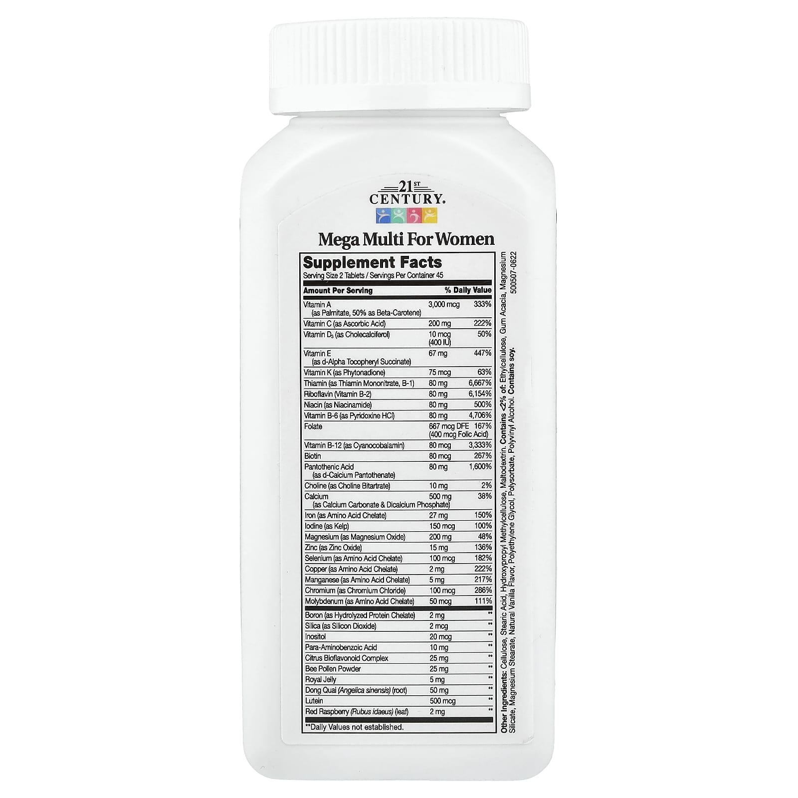 For Health & LifestyleMultivitamin & Multimineral SupplementGluten FreeGuaranteed QualityLaboratory TestedTrusted Quality for Over 30 YearsMega Multi for Women includes antioxidants A, C, and E combined with other essential vitamins and minerals that support women’s health.
