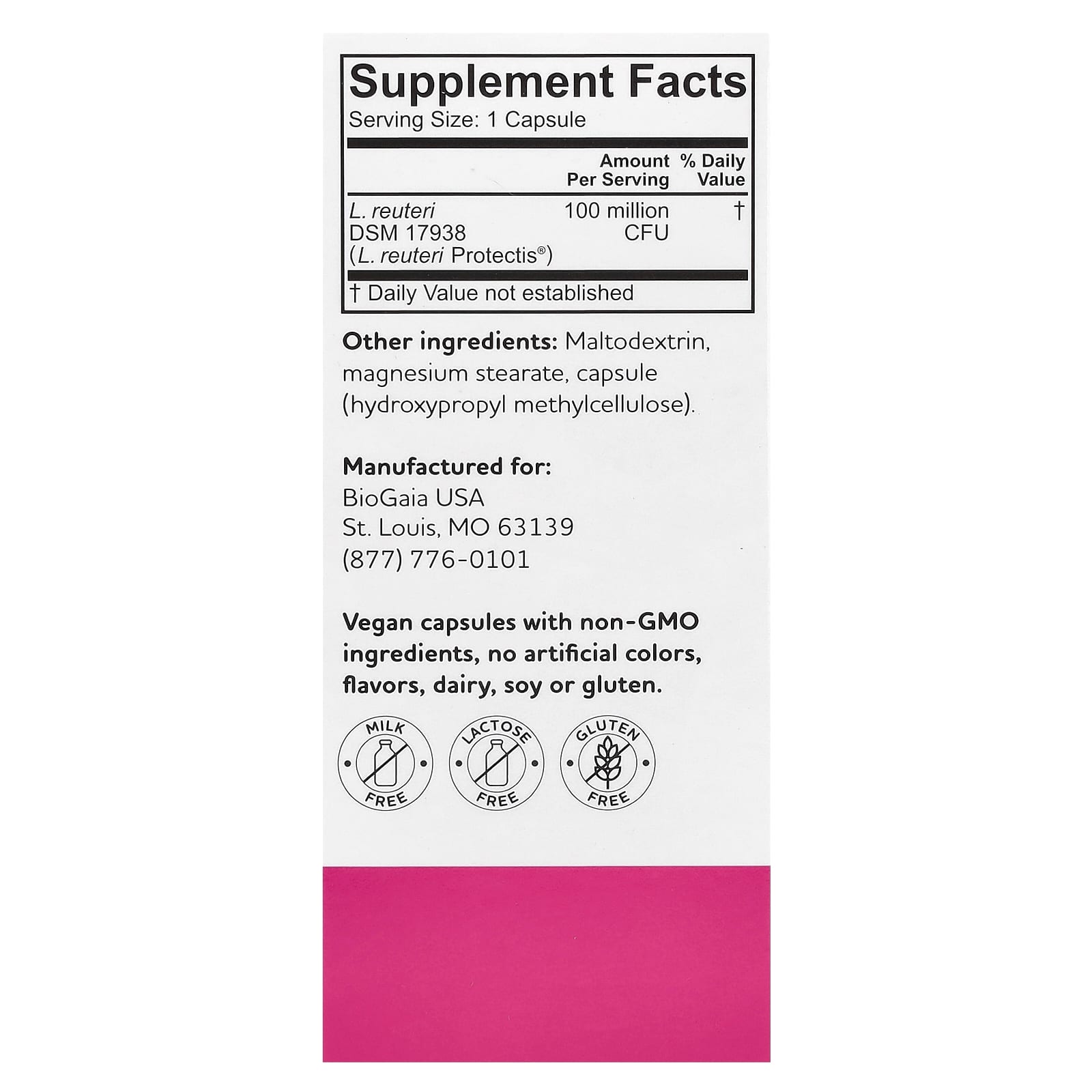 Probiotic Capsules Probiotic Supplement Probiotic Prenatal Care Groundbreaking Probiotics – Driven by ScienceMilk FreeLactose FreeGluten FreeProbiotic capsules BioGaia® Protectis® MUM is a dietary supplement containing the patented lactic acid bacterium Limosilactobacillus** reuteri Protectis R (L. reuteri DSM 17938) that helps the good microorganisms keep a natural balance in the gut.Because L. reuteri Protectis naturally colonizes humans it has a strong adaptation to persist and interact with humans. L. reuteri Protectis has been tested in more than 150 clinical trials and proven safe and effective for moms and babies.** Previously named Lactobacillus