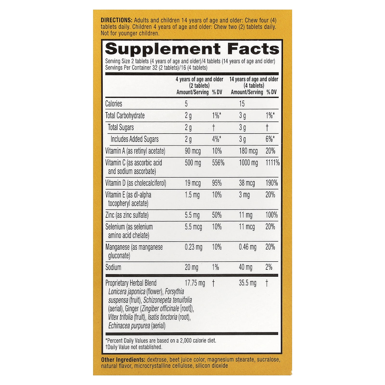 Adults and children 14 years of age and older: Chew four (4) tablets daily. Children 4 years of age and older: Chew two (2) tablets daily. Not for younger children.