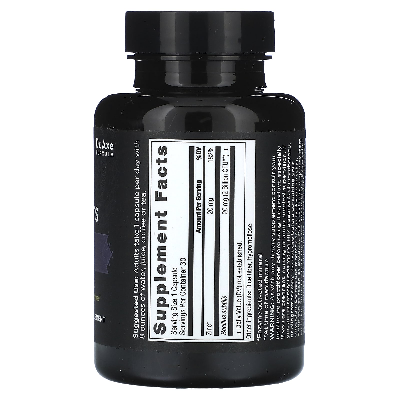 Dr. Axe FormulaDaily Value 20 mg (182%)Supports Healthy Immune DefenseWhole Food Dietary SupplementImmune SupportDigestive SupportBillion 2 CFUYour immune system is your first line of defense. Give it the support it deserves with this potent combination of zinc and probiotics.